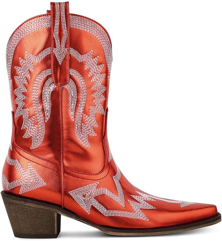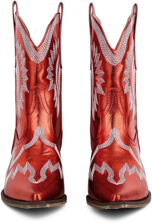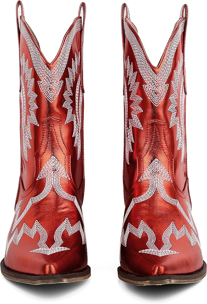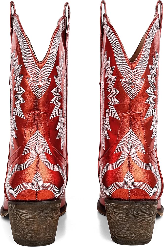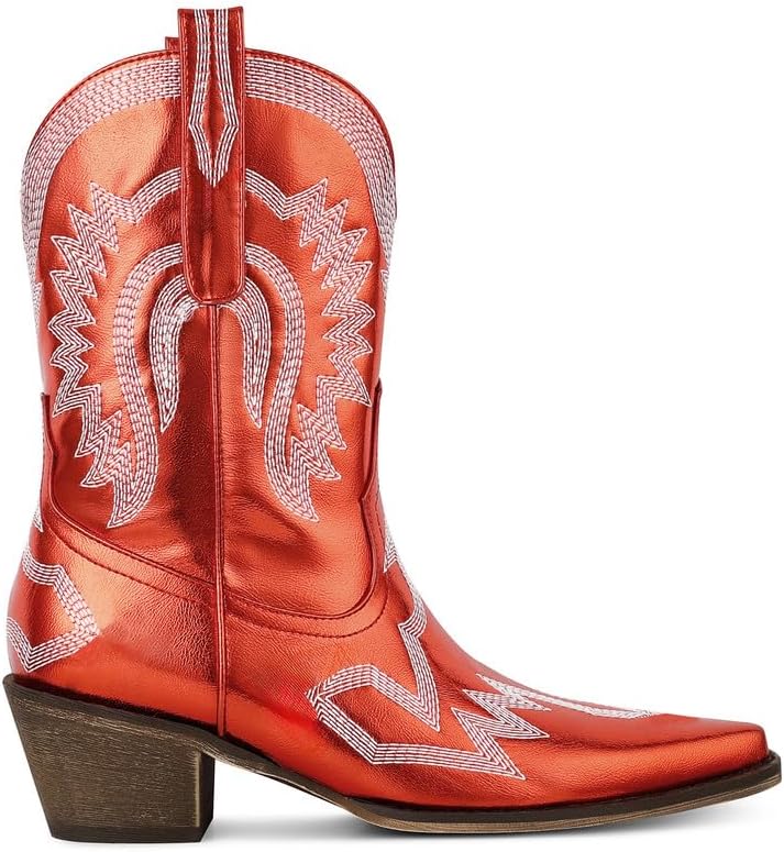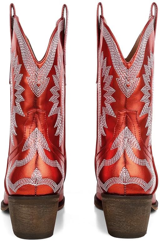 AMINUGAL Cowgirl Boots Chunky Heel Cowboy Boots for Women Pointed Toe Pull On Western Boots Women's Ankle Boots Country Concert Fashion Retro Metallic Booties