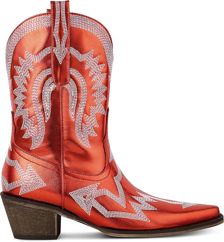 {Material}The soft synthetic lining of these western boots women wicks away moisture, offers a comfortable next-to-skin feel, and provides cushioning to give feet comfort.Country boots for women have a fashionable and classic metallic boots style and are made of high-quality metallic fabrics.