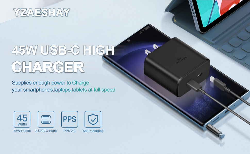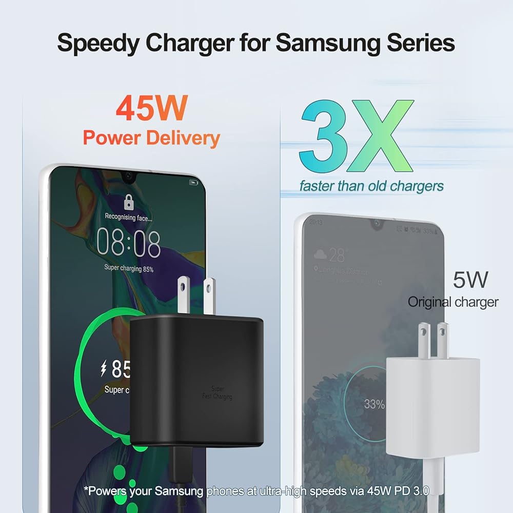 【High Speed 45W USB-C Charger】 45Watt Max Single Port Charging- Support Samsung Super Fast Charging 2.0. Charging your Samsung Galaxy S24 Ultra and S23 Ultra go from 0% to 50% in just 20 min, 0% to 100% within an hour. (Work with USB C Cord, and Single-Port charging only)