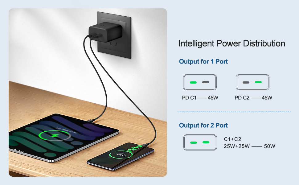 【USB-C Dual Port Charger】 The Samsung Fast Charger Type C with 2 ports 25w, can charger any two of your usb c devices like Samsung S24 Ultra, Samsung S23 Ultra and Samsung S22 Ultra fast and simultaneously at up to 25W each port. When two ports work at the same time, Samsung Galaxy S24 Ultra and S23 Ultra Charger go from 0% to 50% in just 25min. Each port also supports super fast charging.