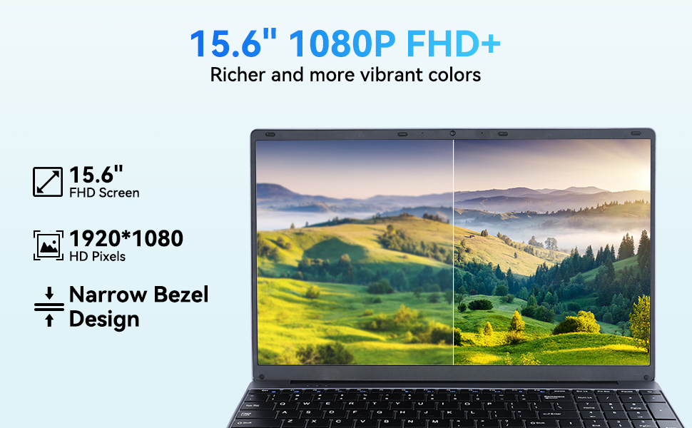 💻【STUNNING 15.6" DISPLAY】The 15.6 inch laptop features a 1920*1080 high-resolution screen, delivering sharp and clear text and images. The 16:9 aspect ratio expands the vertical space of the screen, displaying more content for a comfortable visual experience and greater efficiency when browsing web pages or documents.