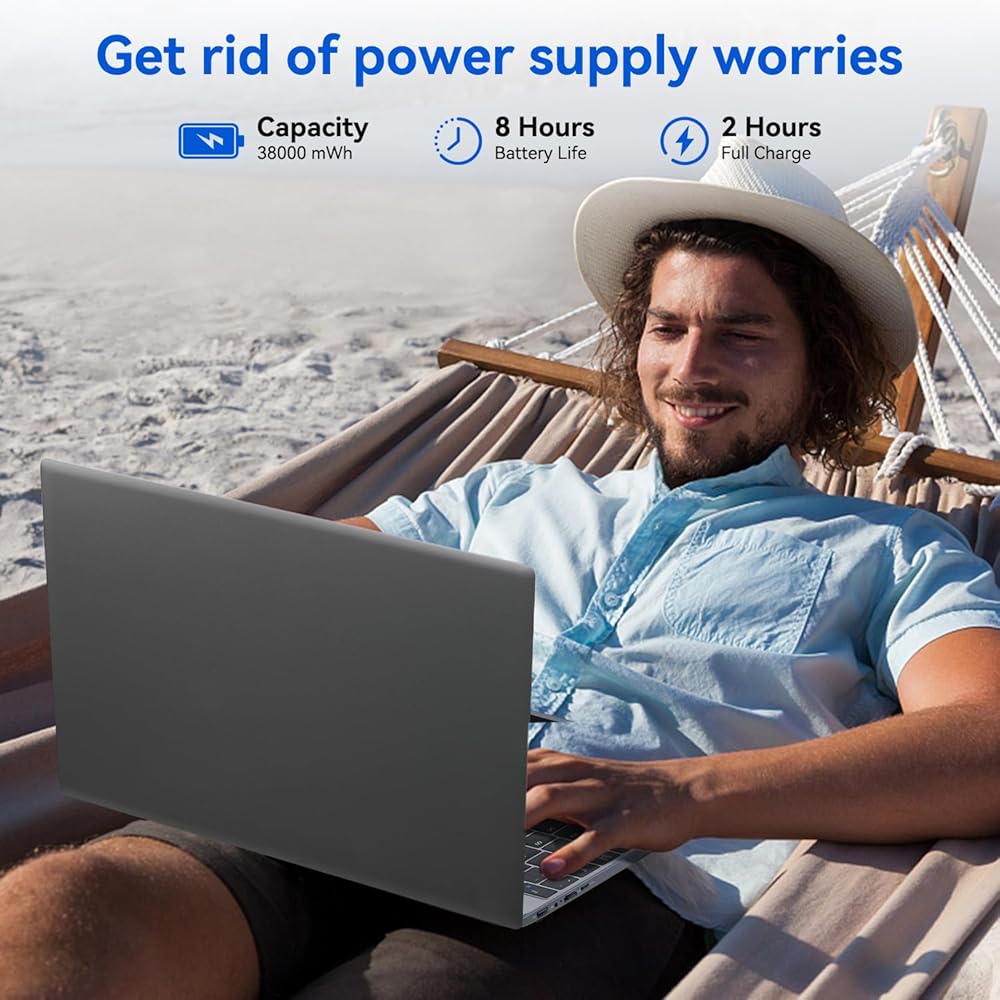 👜【SLEEK AND PORTABLE DESIGN】This laptop is designed with an ultra-thin case for a stylish and innovative look along with excellent portability. With a slim 2cm profile and a weight of just 1.8KG, it's perfect for business trips or traveling. The advanced 38WH rechargeable battery offers up to 8 hours of battery life, making it ideal for daily work and play. It is the top choice for business professionals, office use, or students.