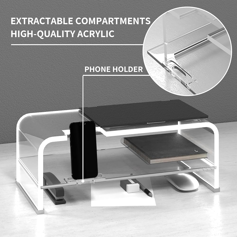 2 Layers Acrylic Monitor Stand with LED Light and Division Board, Clear Computer Monitor Stand Riser with Storage, Gaming Monitor Stand for Office Home, Clear