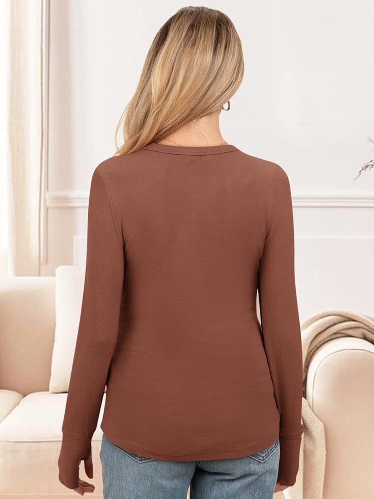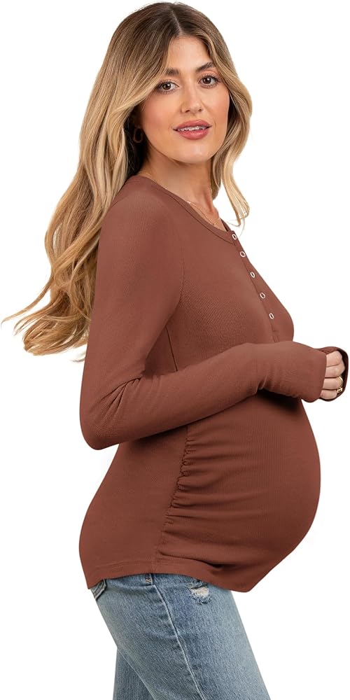 Elegant Chic Designs-Classic round neck, solid color, front button, convenient for breastfeeding. Enough room is friendly and practical for your growing bump belly. Long sleeve maternity top is classic and will keep you warm in all seasons.