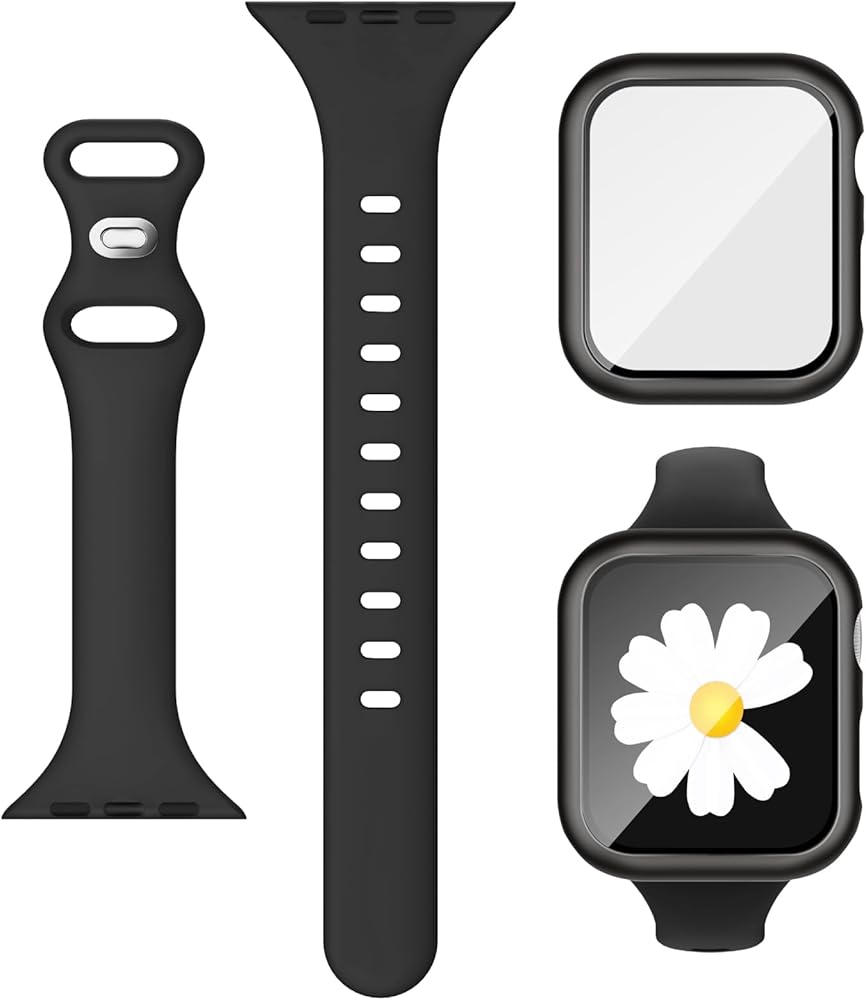 3-IN-1 for Thin Apple Watch Band 40mm 41mm 44mm 45mm with Case & Screen Protector, Slim Skinny Silicone Sport Strap and Cover with 9H Tempered Glass for iWatch Series SE SE2 9 8 7 6 5 4 for Women