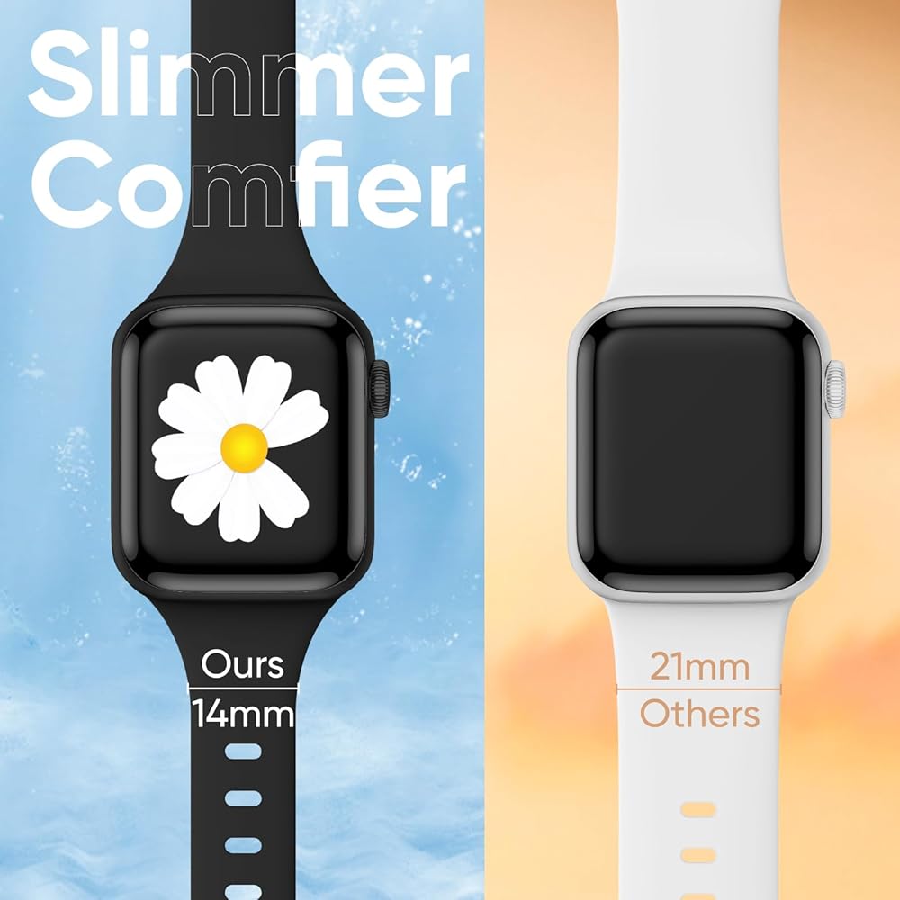 Slim & Comfy Band: Crafted from high-quality silicone, these iwatch bands for women are designed for maximum comfort. The thin apple watch bands for women reduce skin contact, addressing the common issues of sweat buildup and discomfort associated with regular silicone apple watch bands, making them ideal for daily wear, even in hot summer or during intense workouts.