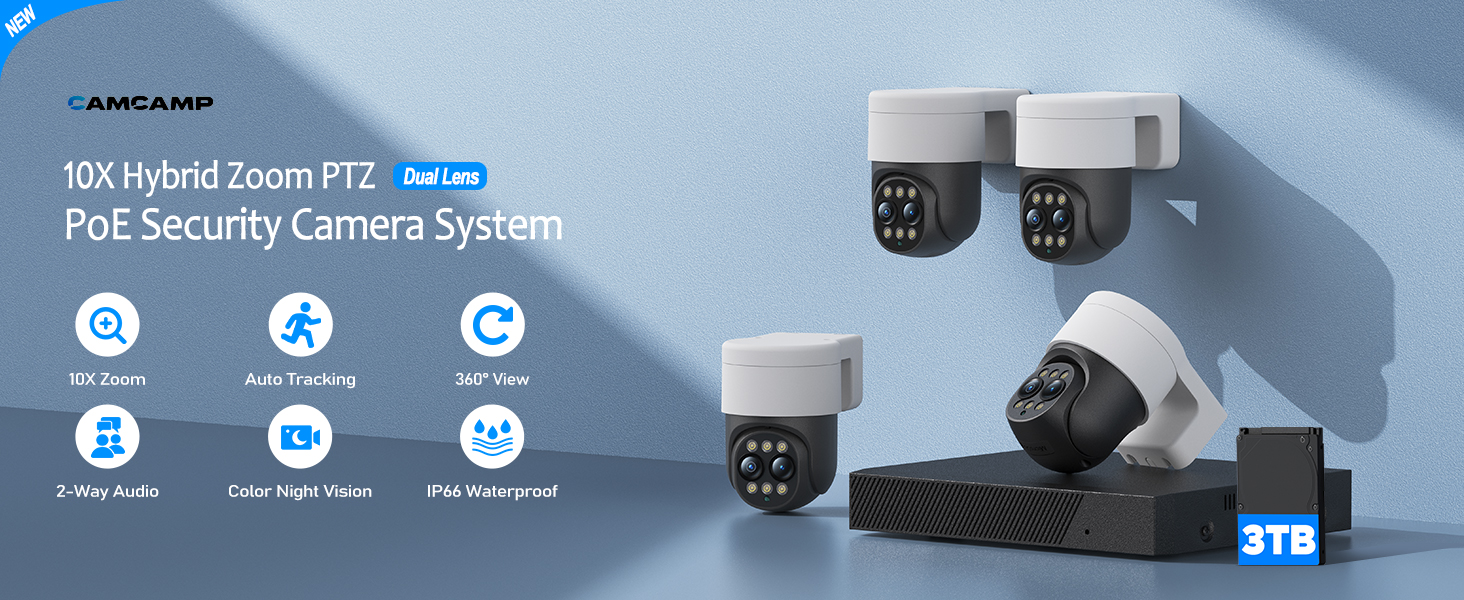 CAMCAMP PoE Security Camera System with Dual-Lens, 4PCS 10X Hybrid Zoom PoE PTZ Surveillance Cameras Outdoor, Auto Tracking, Color Night Vision, 8CH 4K NVR with 3TB HDD for 24/7 Recording