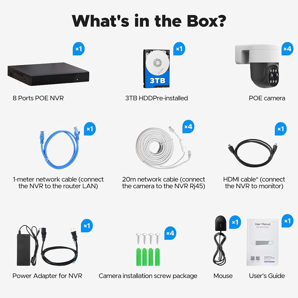 【Pre-installed 3TB HDD & 8CH Expandable】Our PoE security camera system includes a pre-installed 3TB HDD, offering ample storage for continuous 24/7 recording. The system is 8CH expandable, allowing for additional cameras as your security needs grow. This NVR security camera system provides a scalable solution for comprehensive coverage, making it ideal for both small and large properties, ensuring you never miss a moment of critical footage.