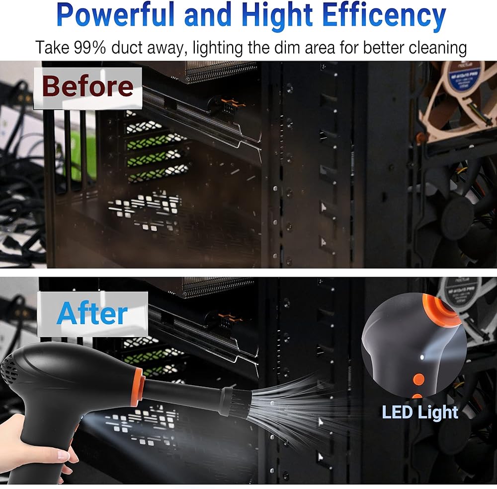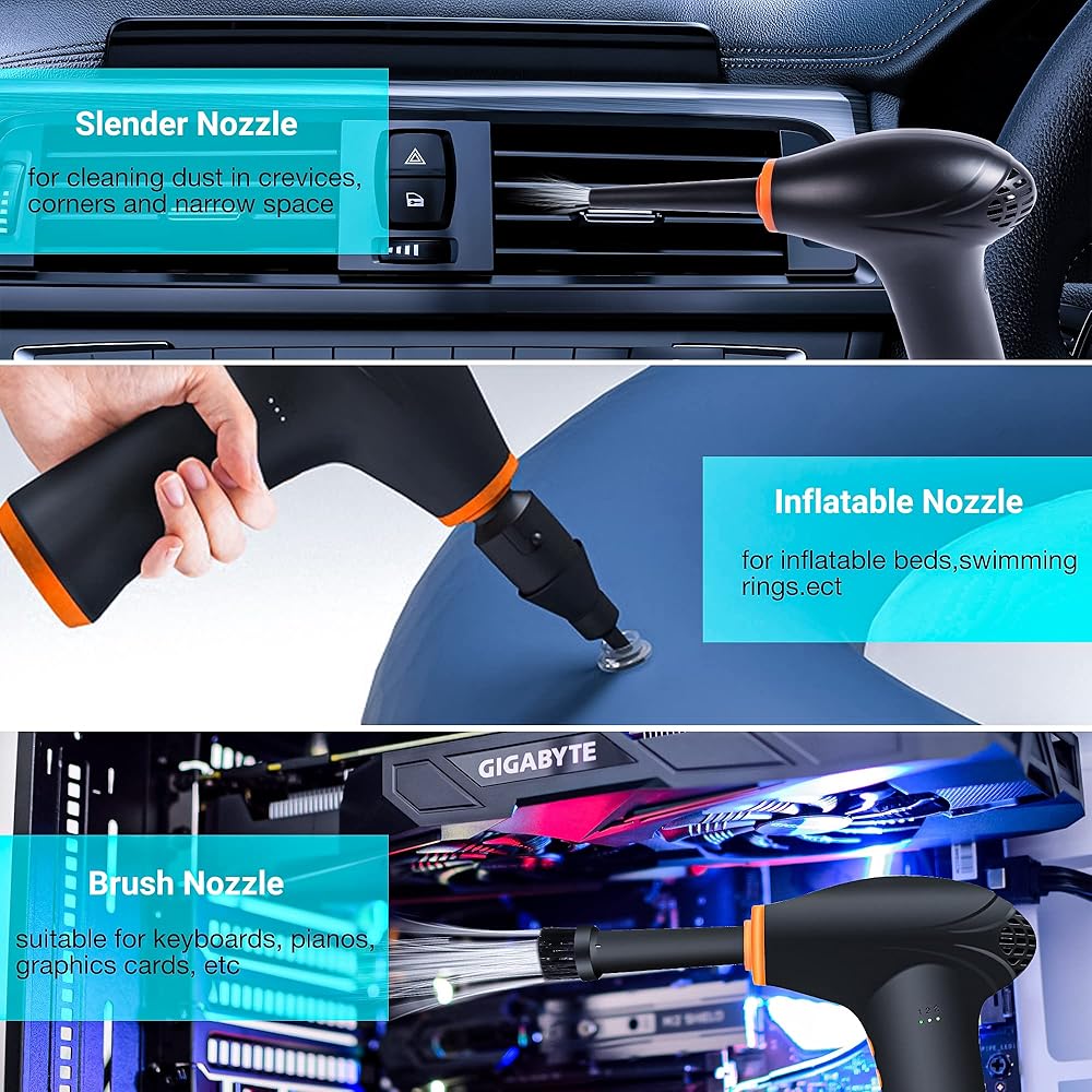 【Wide Application 】Our product has three nozzles ,you can change the nozzle for different occasion.The slender nozzle can be use for cleaning dust in crevices,corners and narrow, the inflatable nozzle is suitable for inflatable beds and swimming rings, the brush nozzle is suitable for keyboards,pianos.This air duster also has LED light, it is more convenient to clean in dark places or at night!