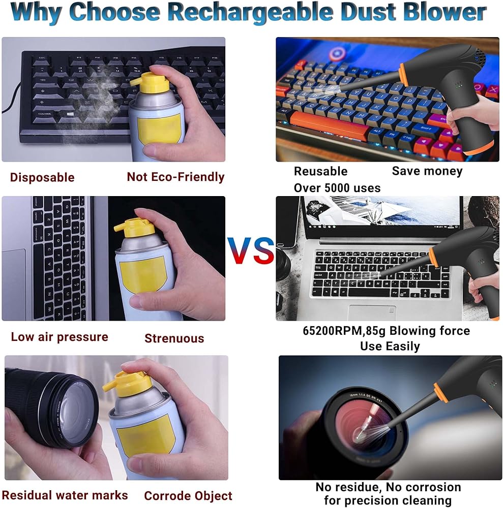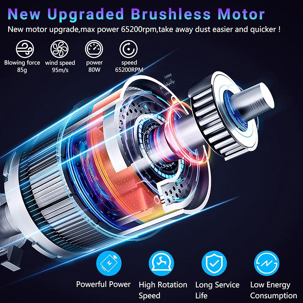 【Powerful Cleaning】This powerful cordless air duster is equipped with new upgraded brushless 80W power motor , can produce the max speed up to 65200RPM.Our air duster has 85g blowing force,the wind speed reach up to 95m/s, it can effectively clean the keyboard,computer. This cordless air duster is a perfect christmas gift for women men grandpa grandma mom dad couple boyfriend girlfriend girl boy wife husband sister brother.