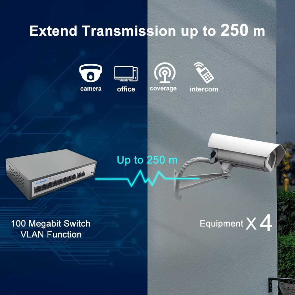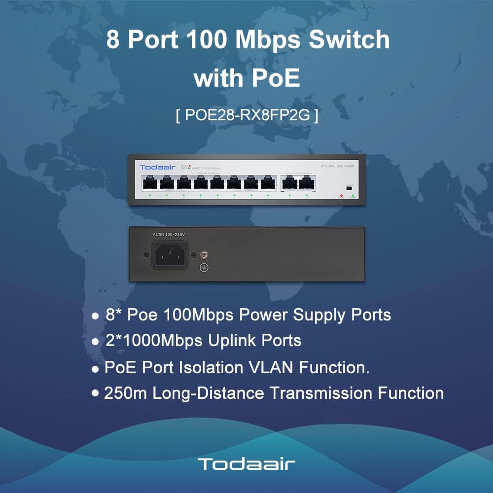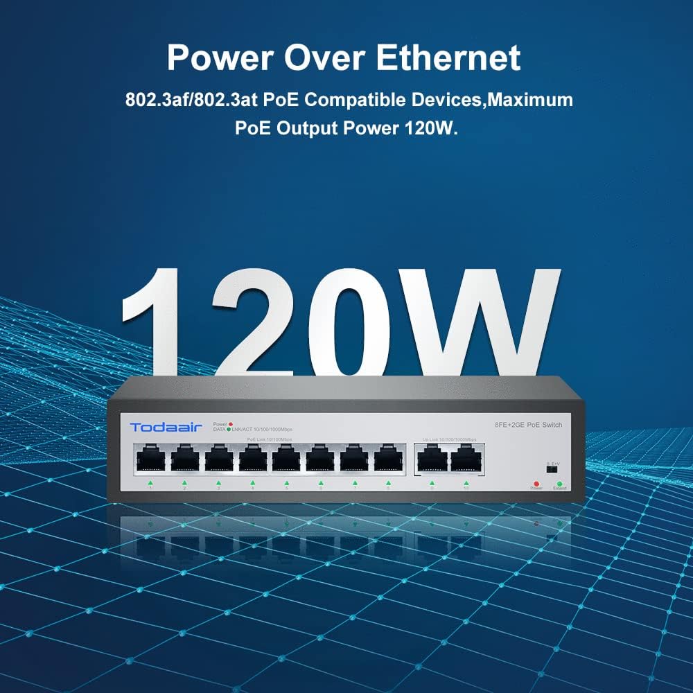 【8*100Mbps POE Power Ports with 2*1000Mbps Uplink Ports】8 POE+ (802.3at/af) 10/100 Mbps RJ45 ports, compliant with IEEE802.3af/at POE standard, each port provides up to 30W, total PoE power is 120W.