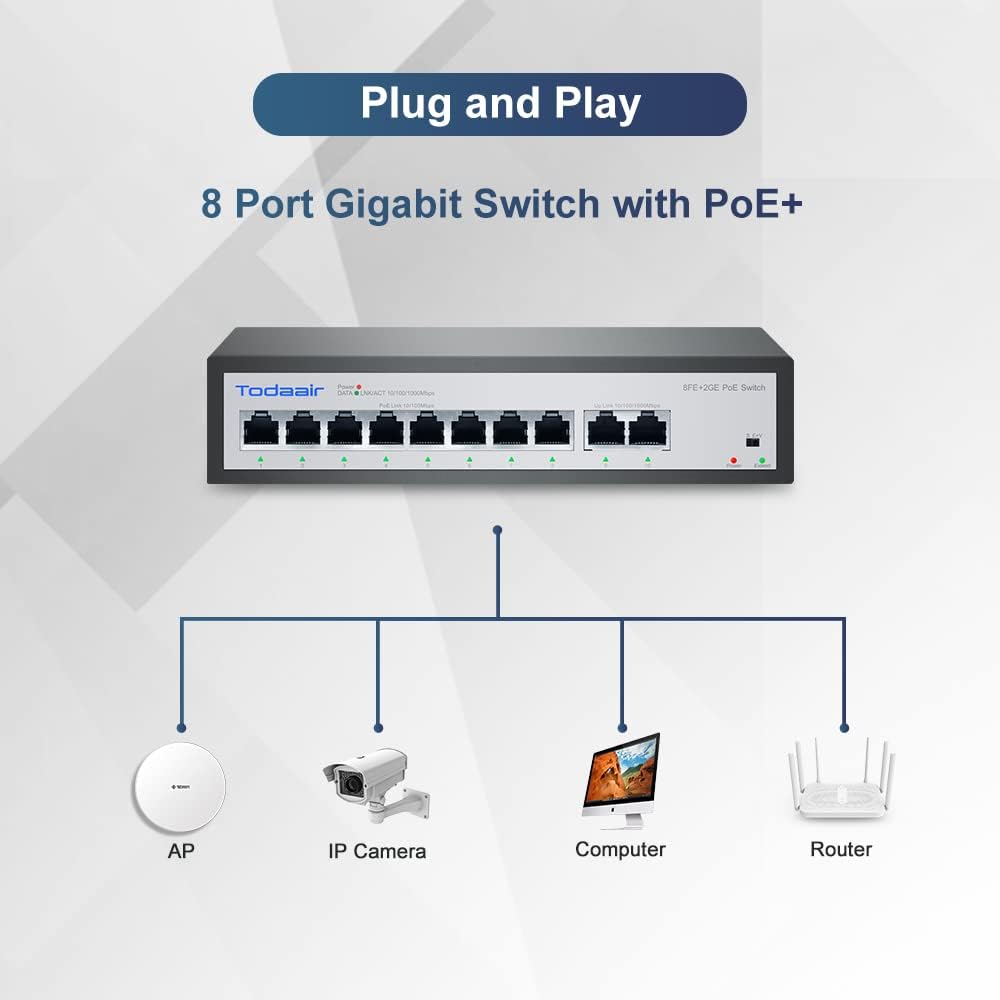 منافذ طاقة POE 8*100 ميجابت في الثانية مع منافذ توصيل 2*1000 ميجابت في الثانية 】8 منافذ POE+ (802.3at/af) 10/100 ميجابت في الثانية RJ45، متوافقة مع معيار IEEE802.3af/في POE، يوفر كل منفذ ما يصل إلى 30 وات، إجمالي طاقة PoE 120 واط.