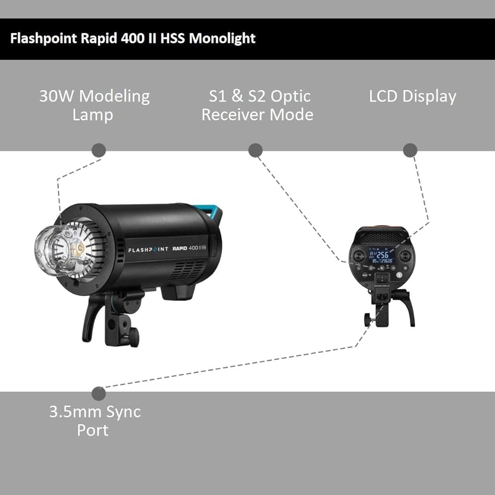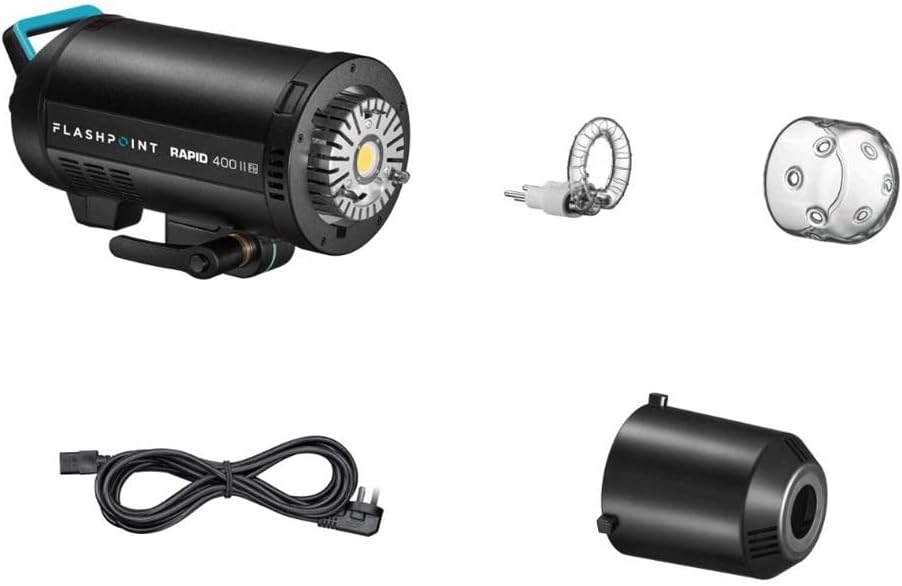 Flashpoint, innovators at the cutting edge of studio and location lighting with a wide selection of flash solutions addressing every lighting challenge, now offer light supremacy even further with the Flashpoint RAPID 1200 II HSS R2 Monolight- the AC powered monolight. Rapid 1200 II champions at recycling, scoring a blazing 0.9-second full-power charge at 344ft / 105m GN with total R2 wireless remote radio integration built-in to interface with all of the R2 Family of products, with rapid-fire and swift Multiflash.Flashpoint designers are innovators at the cutting edge of studio and location lighting, with a wide selection of flash solutions addressing every lighting challenge. Now, we offer light supremacy even further, with the Flashpoint Rapid II R2 Series of monolights. The Rapid II 1200ws AC-powered monolight champions at recycling, scoring a blazing 0.9-second full power down to an incredible 0.01s at 1/256 strength. Total freedom, with R2 wireless remote radio integration built-in to interface with all of the R2 Family of products; The wireless radio remote system is designed to suit the wishes of every type of photographer. The surety of color temperature stabilization. Unbelievable rapid-fire swift Multiflash. Professional features that never fail. The professional specs don't end with power and speed. Exacting digital details with a full menu of Power, Mode, Flash Duration, Sync, Channel, Group, and Custom Feature is clearly displayed on the