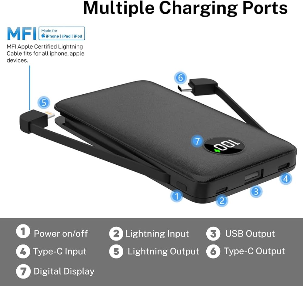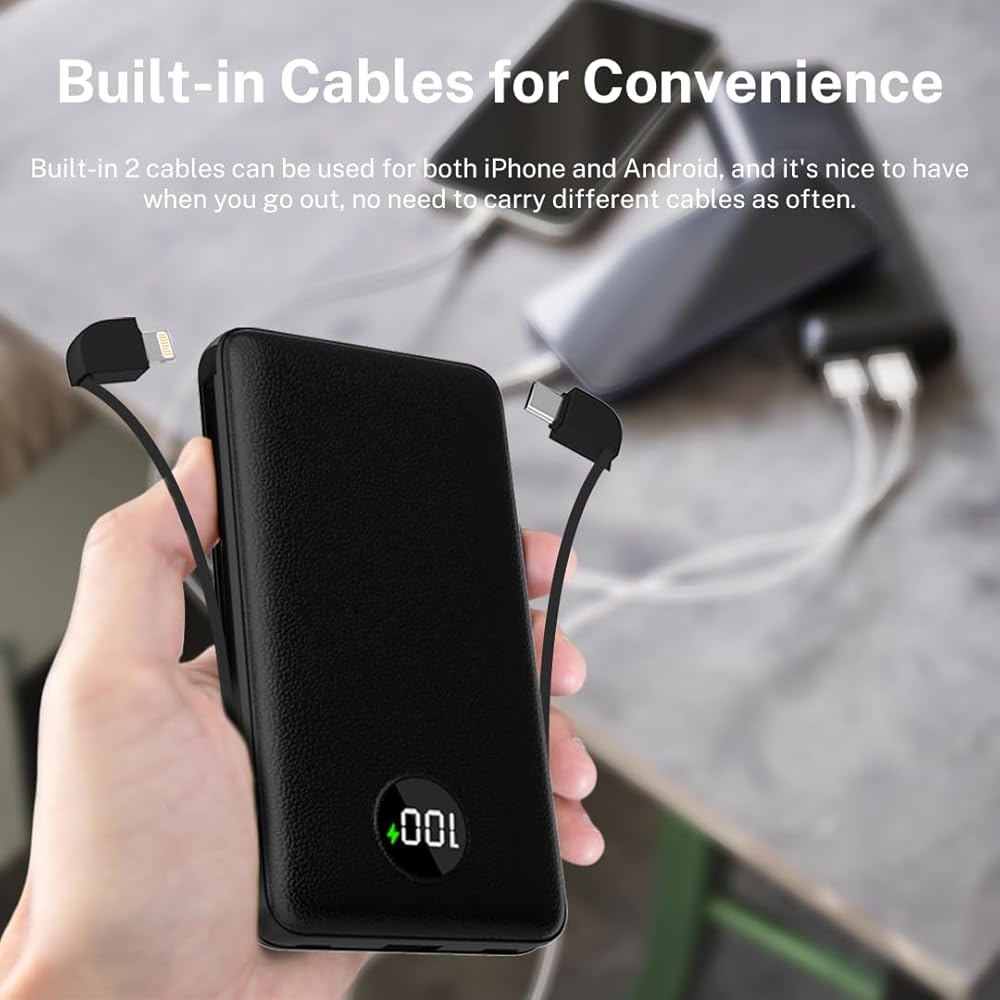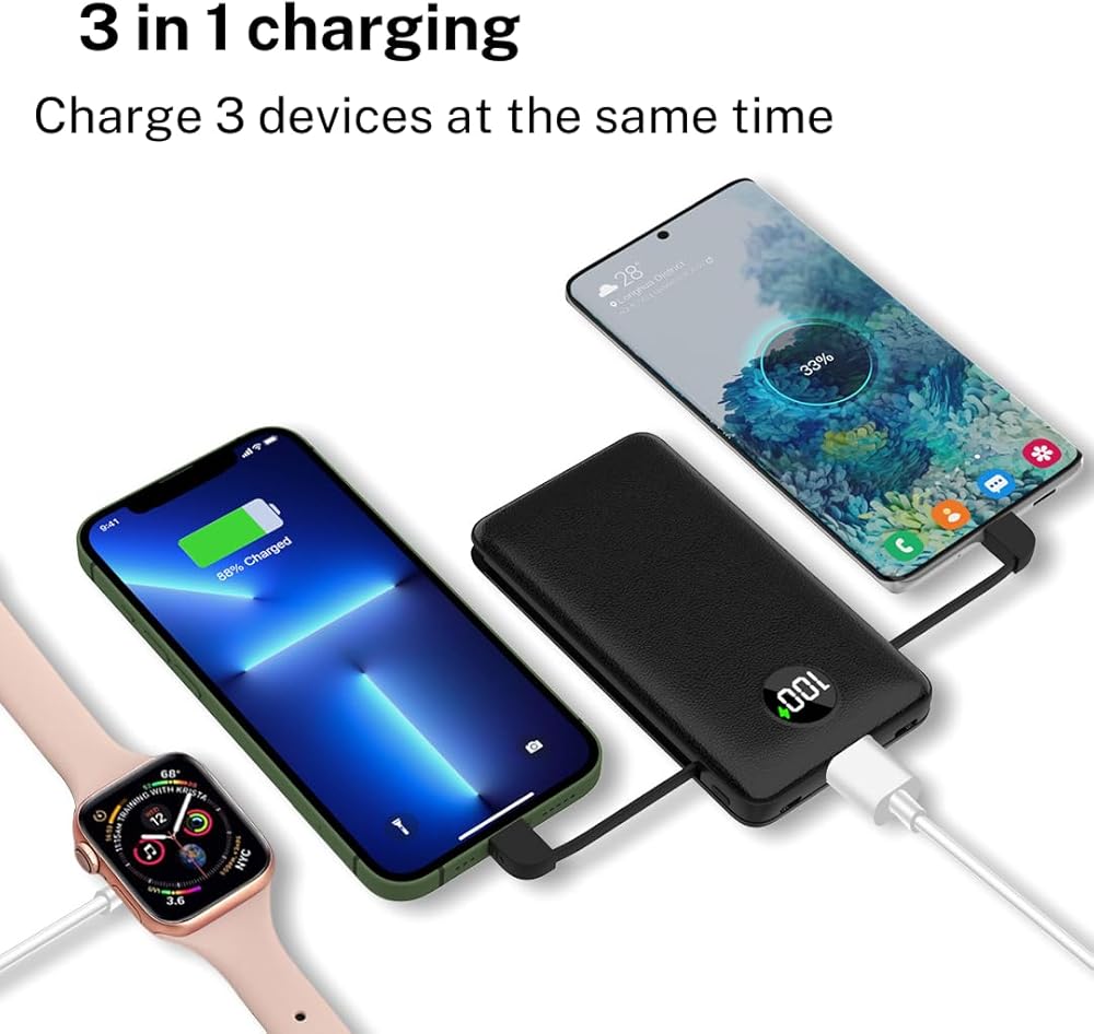 Built In Cable: With built-in lightning and USB-C cables, and one USB output port. Which can charge up to 3 smartphones at the same time. No need to carry a charging cable