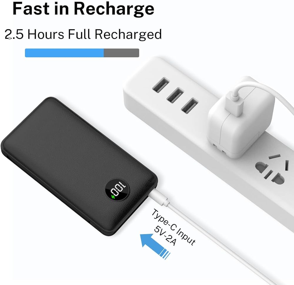 10, 000mAh Capacity: Slim Size with 10000mAh battery for daily use. It charge your phone about 2 times. Fully charging the battery pack only takes 2.5 hours