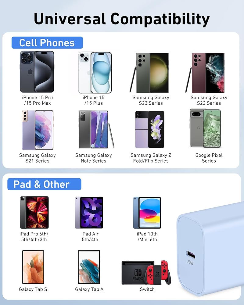 [Specially Designed] 20W USB C charger block with 3FT 6FT 10FT USB C to C Cable fast charge for iPhone 15/15 Plus/15 Pro/15 Pro Max, iPad Pro 12.9/11 inch, iPad 10th, iPad Air 5th/4th, iPad Mini 6. USB C wall charger also fast charge for Samsung Galaxy S23 Ultra/S23/S23+/S22 Ultra/S22/S22+/S21/S21 Ultra/S20/S10/S9/S8 Plus/Note 20/10 Ultra/Z Flip5/Z Fold5/A73/A53 /A71/A70/A80. Google Pixel 8 Pro/8/7 Pro/7/6 Pro/6/5/5a/4XL, Android Phones, and More.