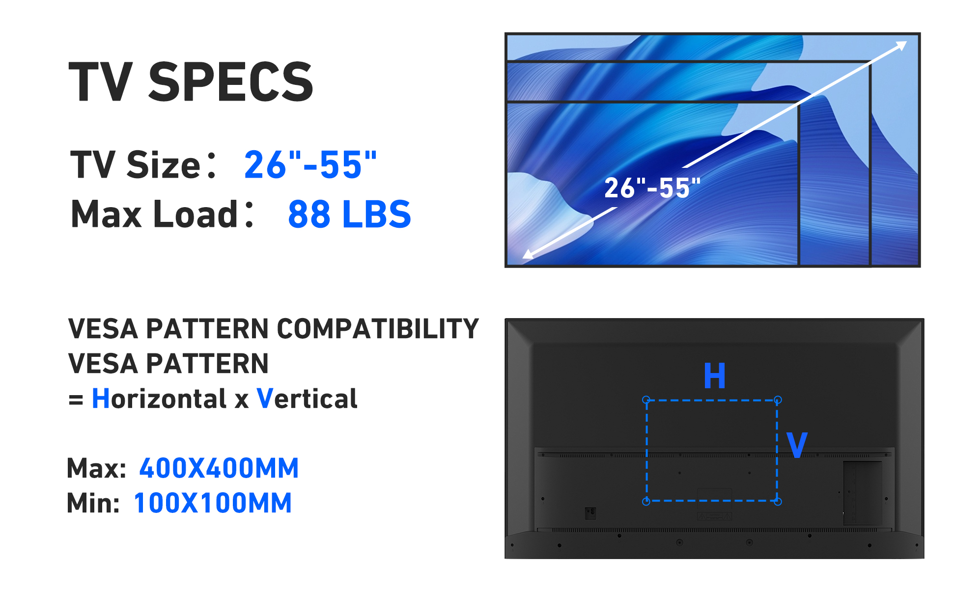 توافق حامل التلفزيون: يناسب حامل الحائط هذا بشكل جيد معظم العلامات التجارية للتلفزيون 26 بوصة - 55 بوصة مثل LG وSamsung وSony وTCL وHisense وToshiba وPanasonic وSharp وغيرها. نمط VESA من 75 × 75 مم إلى 400 × 400 مم، متوافق مع مسمار الخشب وتركيب جدار خرساني صلب. يرجى التحقق من حجم الشاشة ووزنها ونمط VESA الخاص بالتلفزيون الخاص بك قبل الشراء.