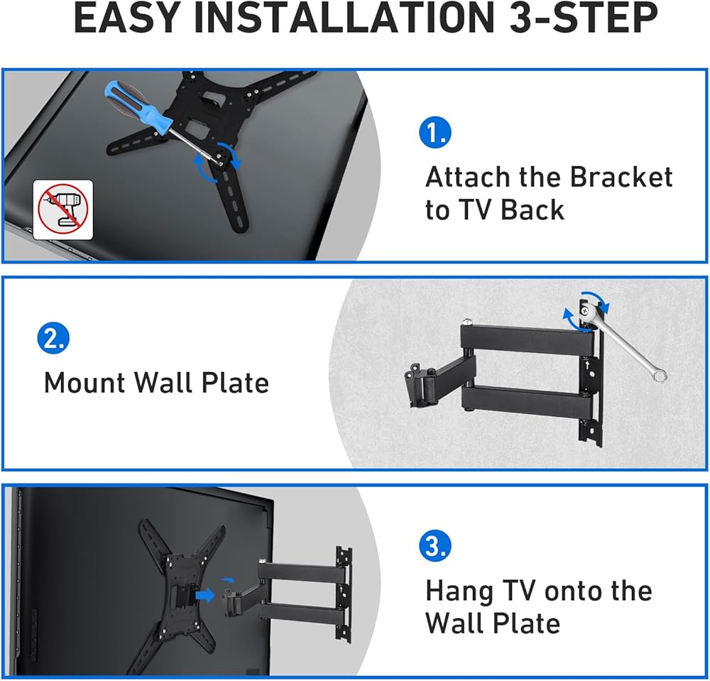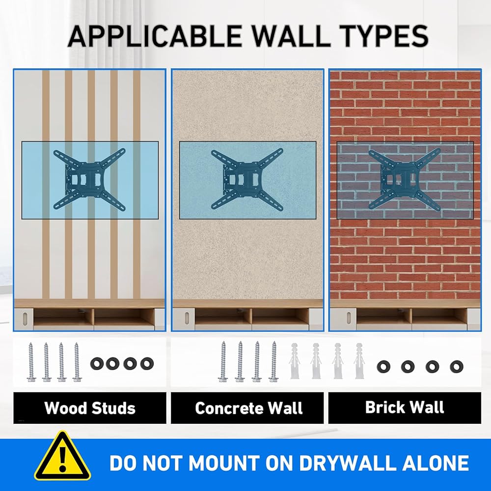 تركيب سهل وسريع: يأتي حامل التلفزيون المثبت على الحائط مع مجموعة أدوات التثبيت ومستوى الفقاعات وتعليمات مفصلة لسهولة التركيب. تم تصميم هذا الدعامة للتركيب على الحائط الخرساني الصلب. لا تقم بتثبيته في الحوائط الجافة وحدها.