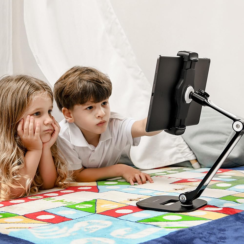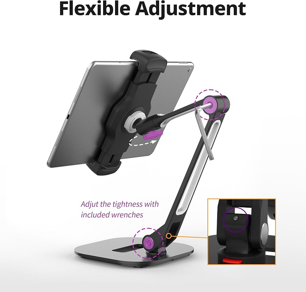 The "14"" long aluminum arm with 360-degree rotation and multi-angle folding capabilities provides hands-free convenience for your display and entertainment experience.