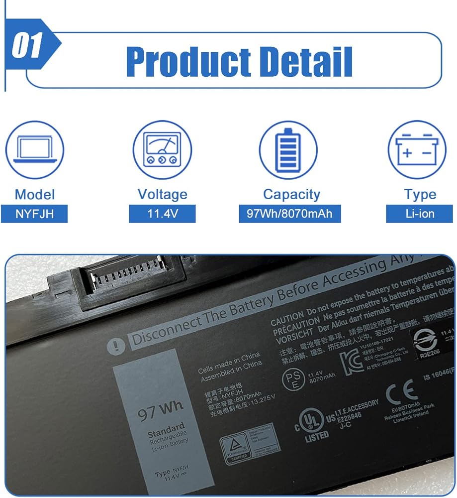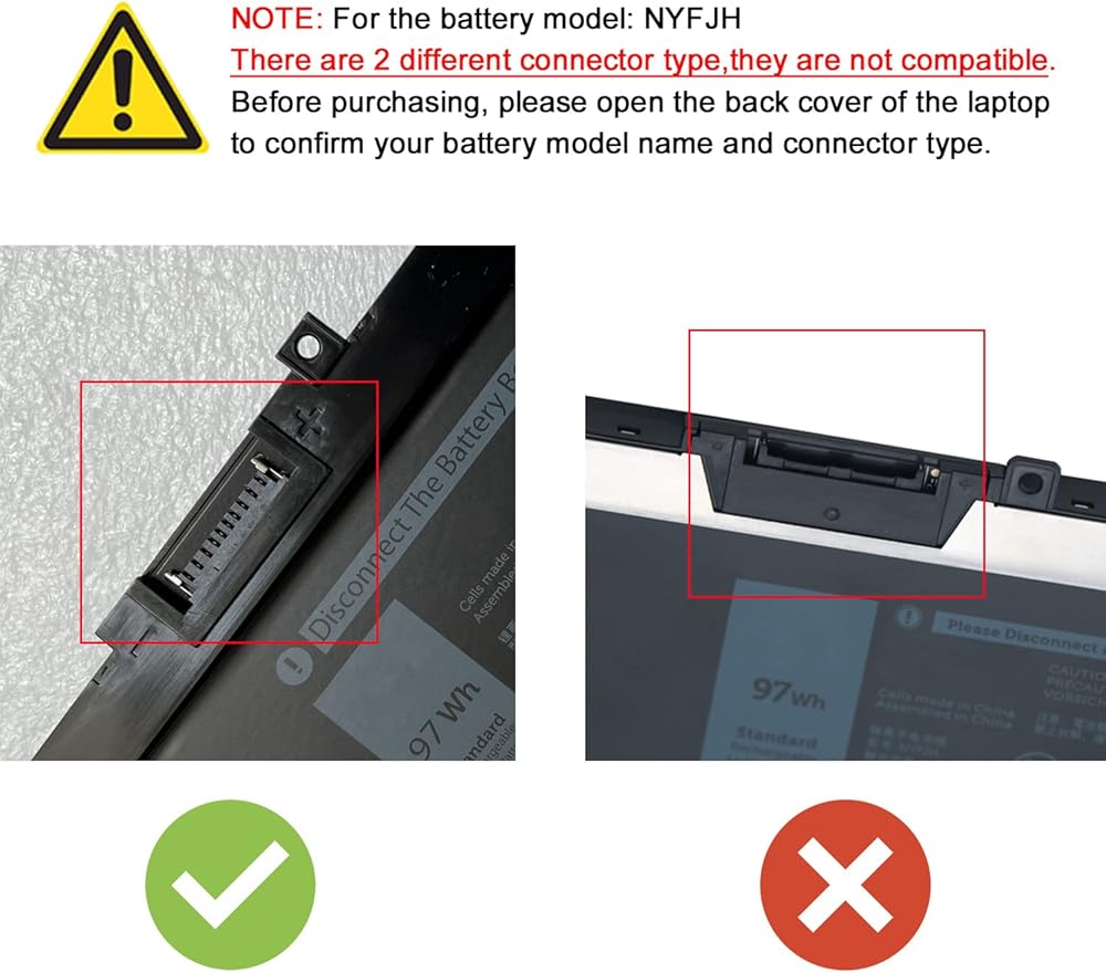 👍👍【Dell Authentic OEM Parts】Item Model: NYFJH; Battery Type: Li-ion; Voltage: 11.4V; Capacity: 97Wh/8070mAh; Battery Color: Black. 【Note】There are two kinds of connectors for NYFJH battery, please make sure your original battery is the same as the picture before placing order.