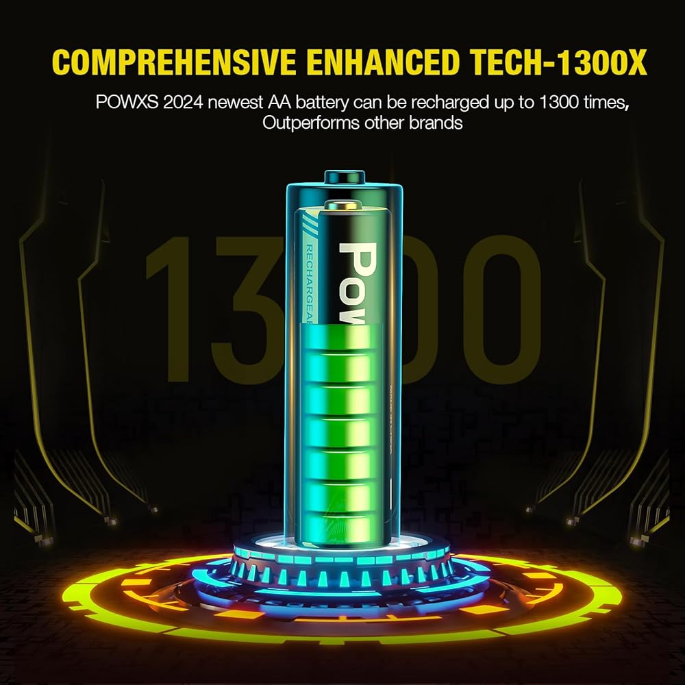 🔋【1300 Times Long Cycle Life】With an ultra-low self-discharge rate and 1300 recharge cycles, POWXS 1.2V AA rechargeable batteries boast a lifespan of 10 years, emphasizing outstanding energy conservation and eco-friendliness.