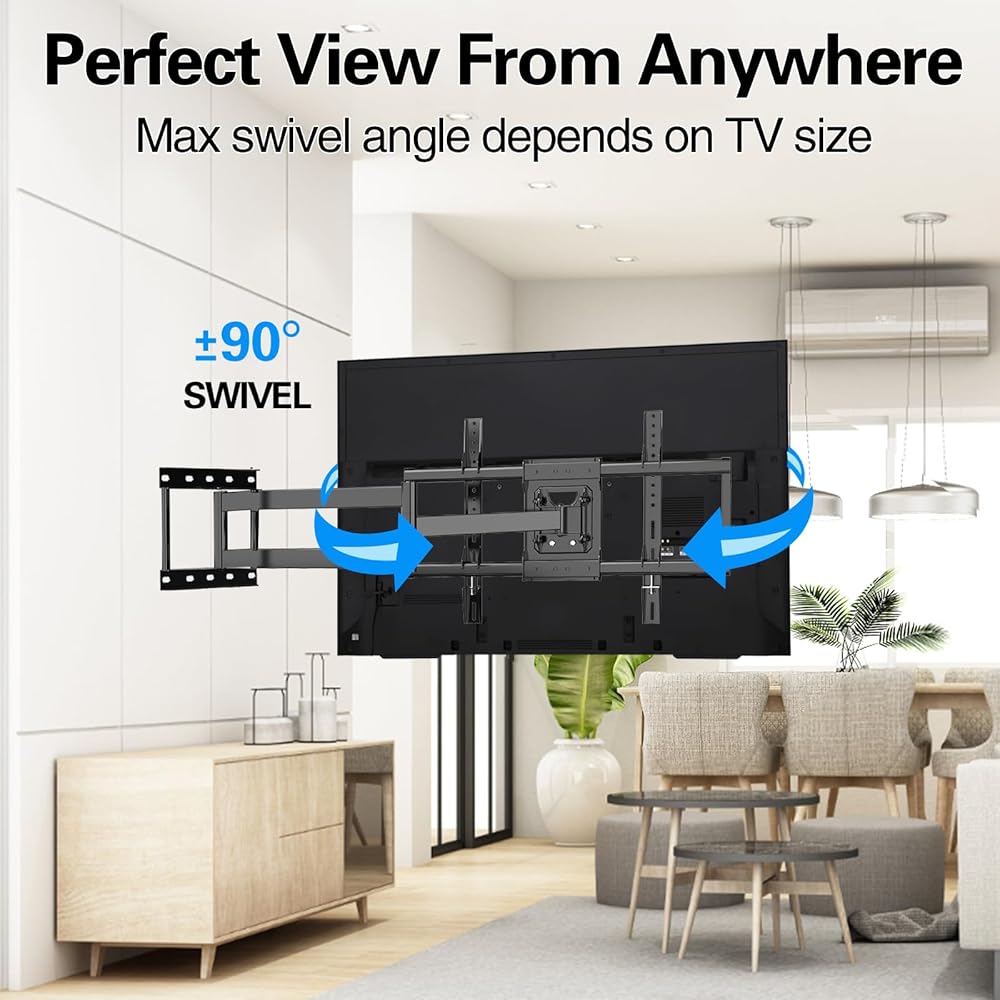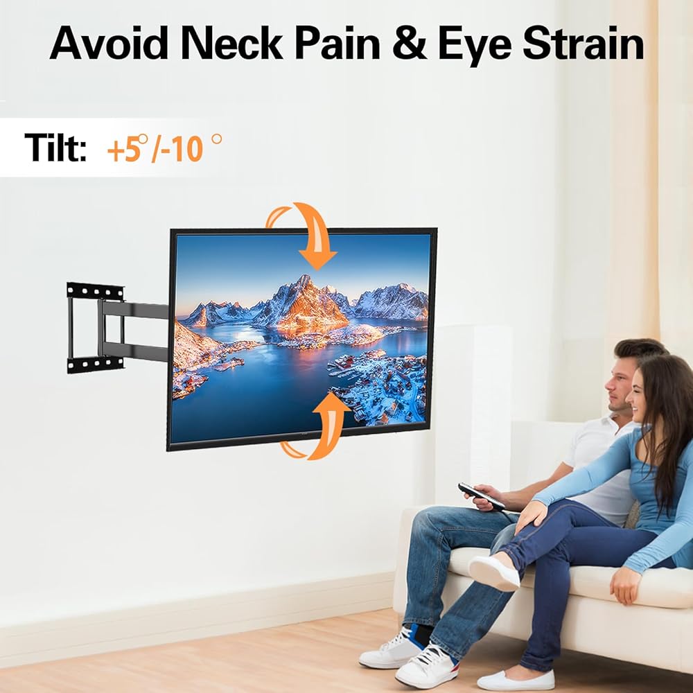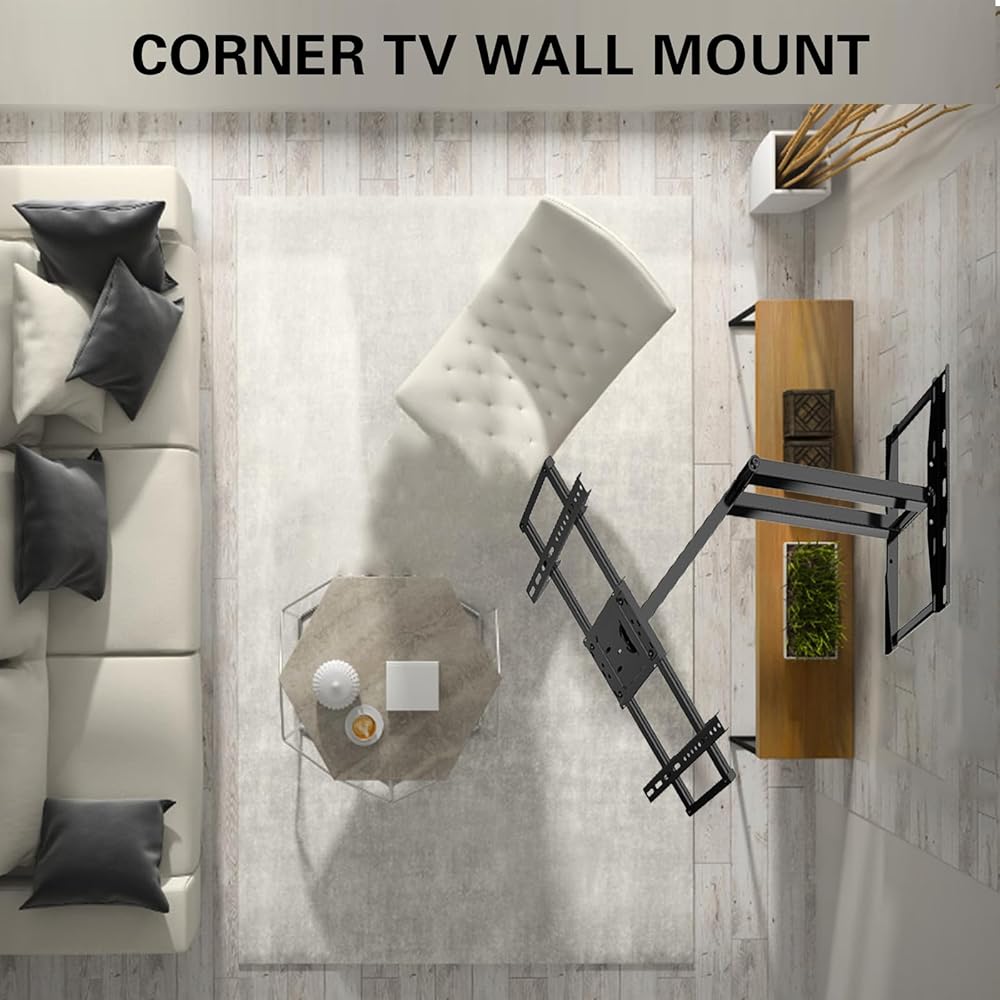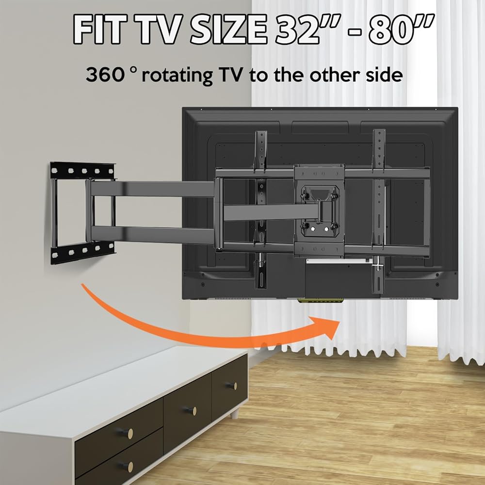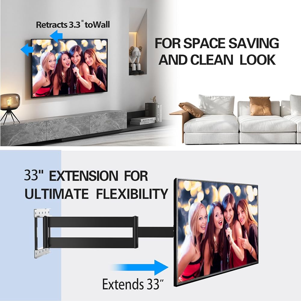 Saving Space:The Full Motion TV Wall Mount can pull a TV out from the wall up to 33.7 inches to meet different viewing needs or help better position the television for all viewers in a room,. Extra-long arm design also makes it an ideal choice for corner placement.too retract back to 3.3”, which saves valuable space and make your house look neater.