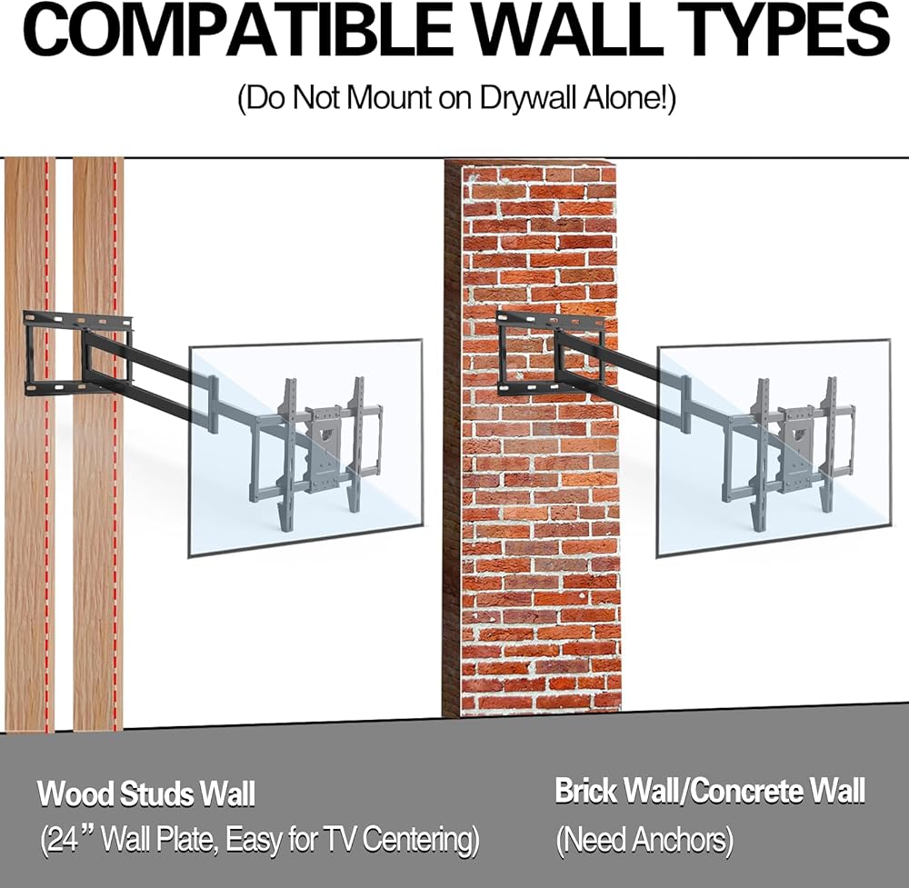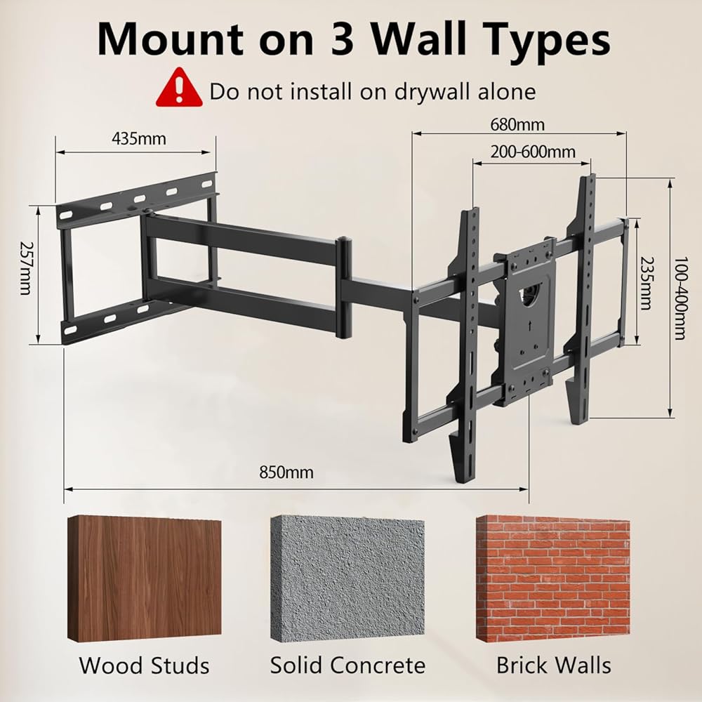 Universal TV Mount: Extension Long Arm TV Wall Mount, VESA patterns 600x400mm and holds up to 88 lbs(40kg)) and 16''18''24'' wood studs spacing. Just make sure to measure the VESA distance and TV weight.