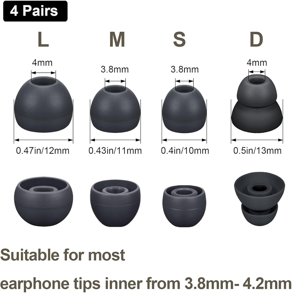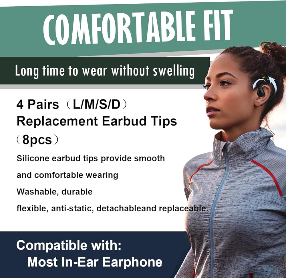 REPLACEMENT EAR TIPS SIZE: 4 types of eartips, small (10mm), medium (11 mm), large (12 mm) and double flange (13 mm), Water-washable, Durable, Flexible, Antistatic, Removable and Replaceable.