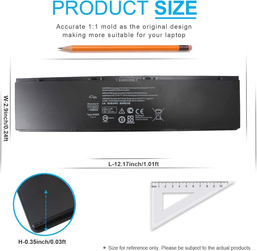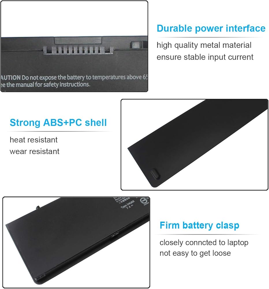 SPECIFICATION : Model Name: Standard Rechargeable Li-ion Battery Type 34GKR; Device Type: Notebook battery, Technology: 4-cell lithium ion; Voltage : 7.4V; Capacity : 47Wh; Color: Black; Weight: About 12oz / 0.75lb; Size(L x W x H):About 12.17x2.9x0.35inch; Life span: around 300-500 discharge/charge cycles. Condition : 100% New; Packages includes: 1PC 34gkr replacement laptop battery.