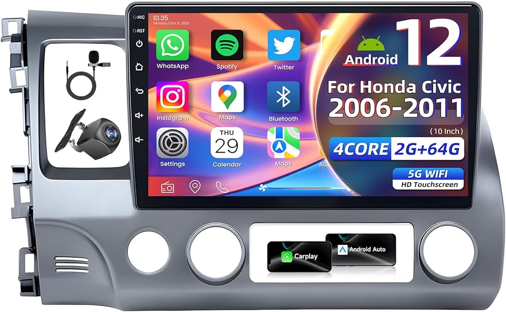 4 Core 64G Car Radio for Honda Civic 2006-2011: 10.1" Touch Screen Stereo with Wireless Carplay Android Auto 5G WiFi GPS Bluetooth FM RDS SWC AHD Backup Camera