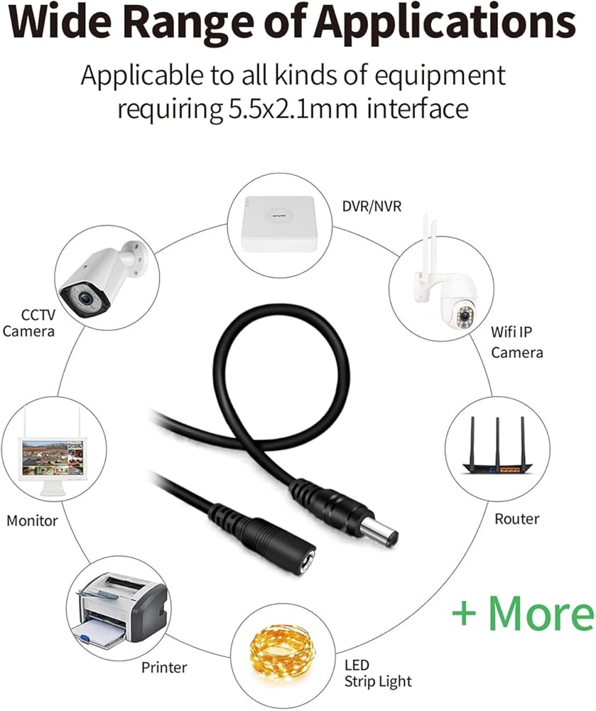 Easy to use:Featuring a plug-and-use design, this cable provides instant use so that you can extend the reach of your cameras in no time.Plug the female jack into an AC to DC power adapter to power multiple electronic devices.Different options of lengths make this cable suitable for locales of different sizes.