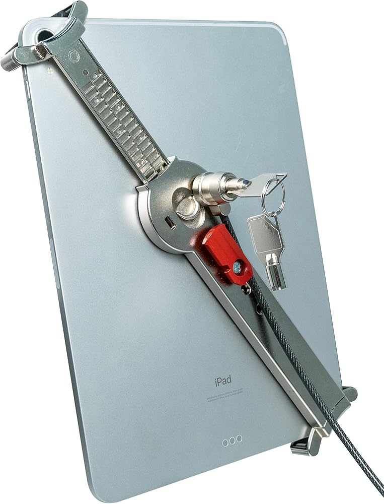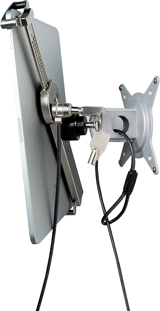 Perfect for classrooms, waiting rooms, reception areas, and more, This clever locking tablet mount gives you a clean, adjustable display mount for your tablet on a wall or VESA arm while still allowing full theft protection in handheld use. The locking tablet holder disconnects from the VESA mount with the simple click of a button. While disconnected from the mount, your tablet stays locked in the metal security grip and anchored to any permanent fixture with a galvanized steel security cable. Let your customers complete their transactions in the palm of their hand or browse your digital catalog without fear of theft. The metal VESA mounting plate allows full side-to-side angle adjustment and 360-degree rotation for portrait and landscape orientations, and can be mounted directly to a wall or onto a VESA compliant arm. Features: quick-connect mechanism allows fast switches between handheld and wall setups quickly connect tablet security grip to wall mount locking to mount with security cable Resizable security grip holder protects tablet from theft wall mount allows 360-degree rotation and angle adjustment compatible with 8-12.75 inch tablets, including iPad 10.2-Inch (7 gen), 11-inch iPad Pro (2018), iPad Mini, iPad Gen. 6 (2018), and more. CTA Digital's security products are designed to protect your device from theft. Products are made with high-quality materials, like reinforced heavy aluminum slots, steel cables, and secure lock-and-key systems. Where CTA Digital makes every effort to protect against destruction of or loss of property, we cannot guarantee, and cannot be responsible for any event that leads to the damage or theft of a device. Specifications: tablet grip Dimensions: 8” x 2” VESA plate Dimensions: 4.25” x 4.25” wall mount distance from wall: 4 inches VESA compatibility: 75x75 and 100x100 weight: 2.3 lbs. Package contents: (1) tablet security grip holder (1) VESA wall mount (1) Security cable (2) keys (1) Set of mounting hardware