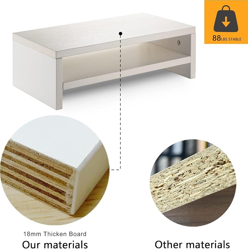 Made of durable materials, the computer stand for the table is made of quality materials and thickness of each layer reaches 0.7 inch, which a maximum load-bearing capacity of 88 lbs. It can be used for a long time. The durable thick board platform can meet your daily needs and accommodate most office equipment such as phones, TV monitors, etc.
