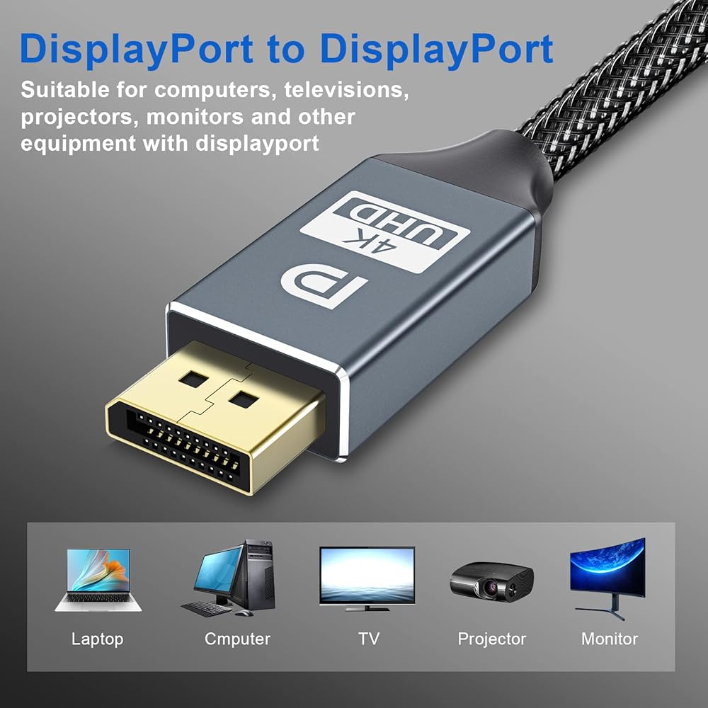 Veetop Displayport to Displayport Cable 2m/6.5FT 1.2 DP 4K@60Hz, 2K@165Hz, 2K@144Hz Vesa Certified High Speed DisplayPort Cord with Nylon Braided for Monitor Laptop PC TV etc-