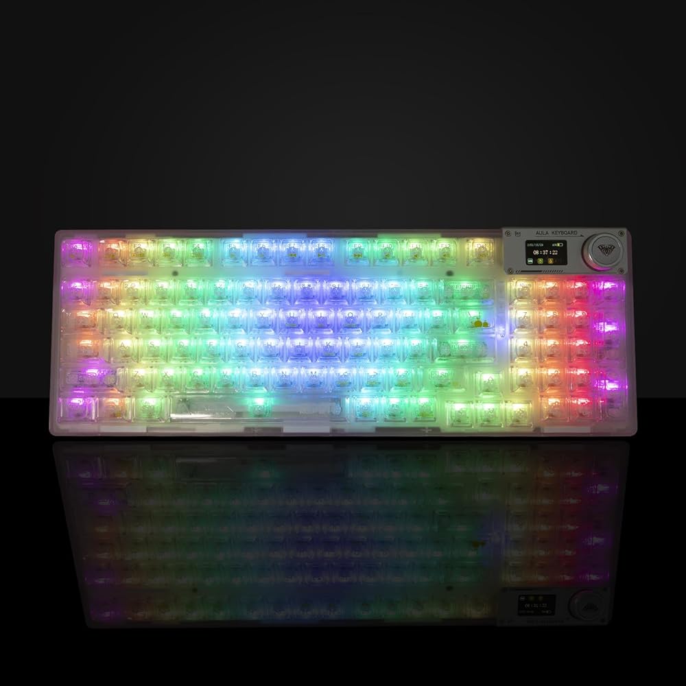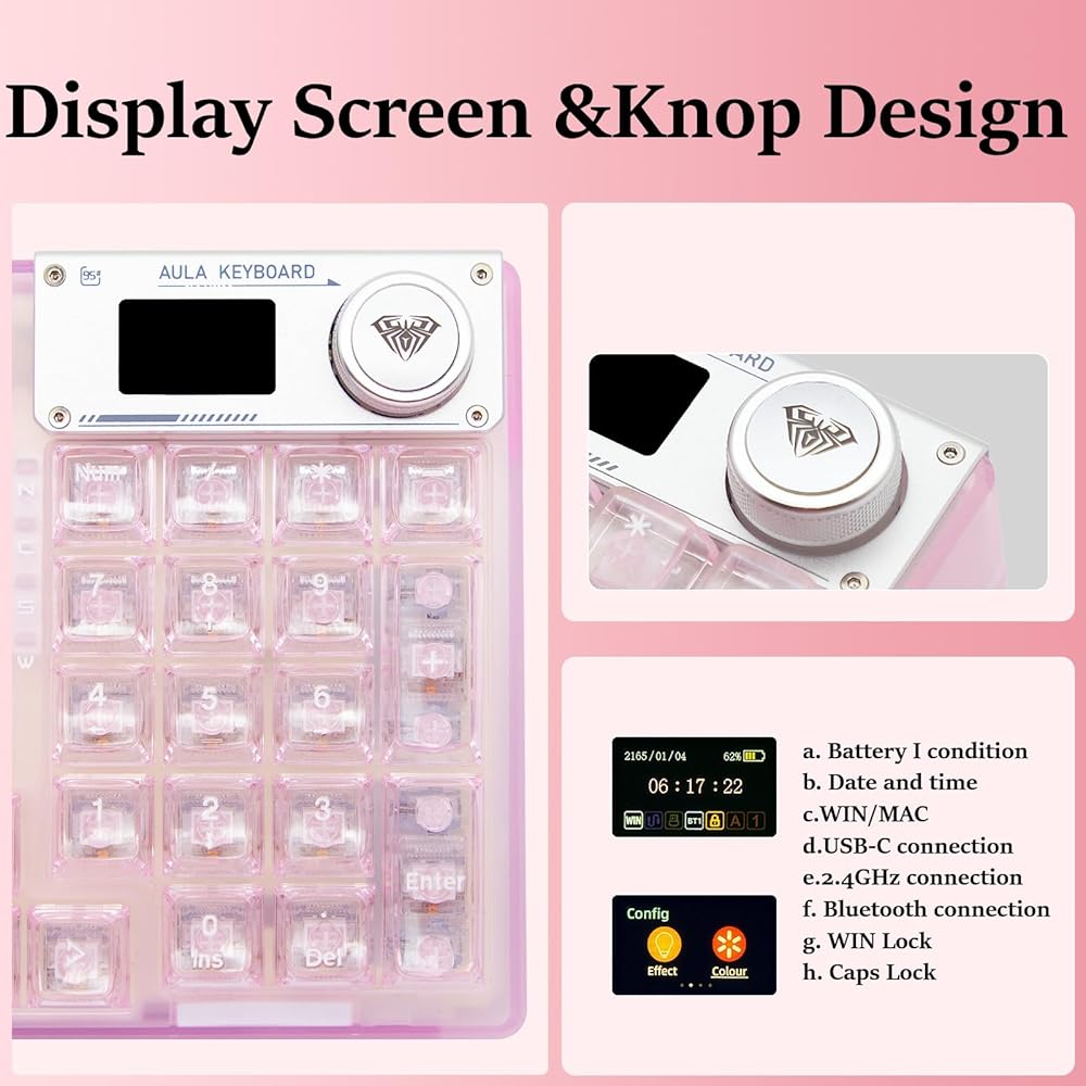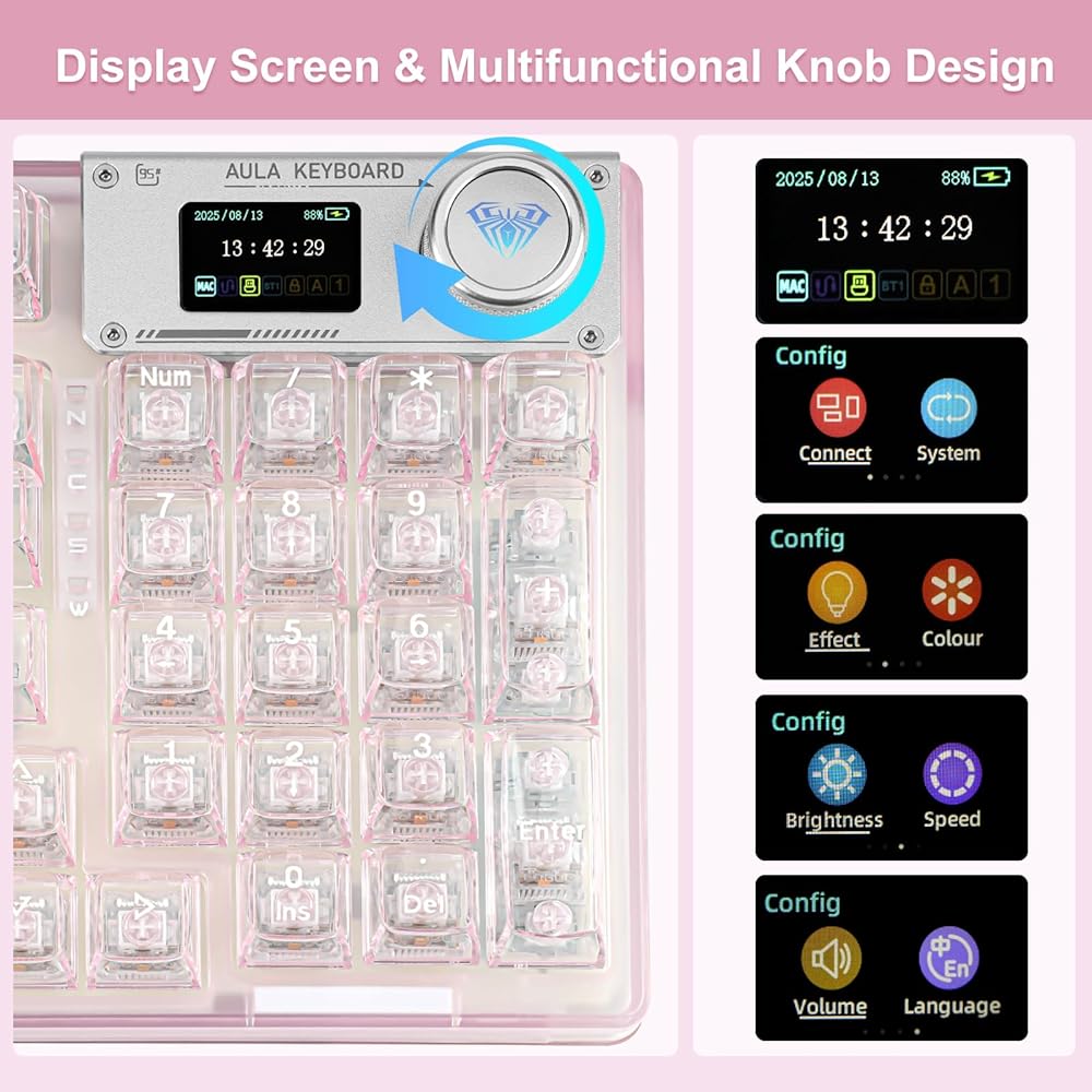 【Transparent keyboard with OLED smart display】The OLED screen casing is protected by an aluminum alloy, adding a mechanical touch to this stylish keyboard. the OLED screen switches between display screens by turning a knob. It is mainly divided into a main page, a GIF page, and a function settings page. On the function settings page, the user can adjust the keyboard connection mode, system switching, backlight mode, color, brightness, speed, volume control, and language selection with the knob. You can also customize and draw your own images and GIFs using software compatible with WIN(Driver software is not available for mac systems).