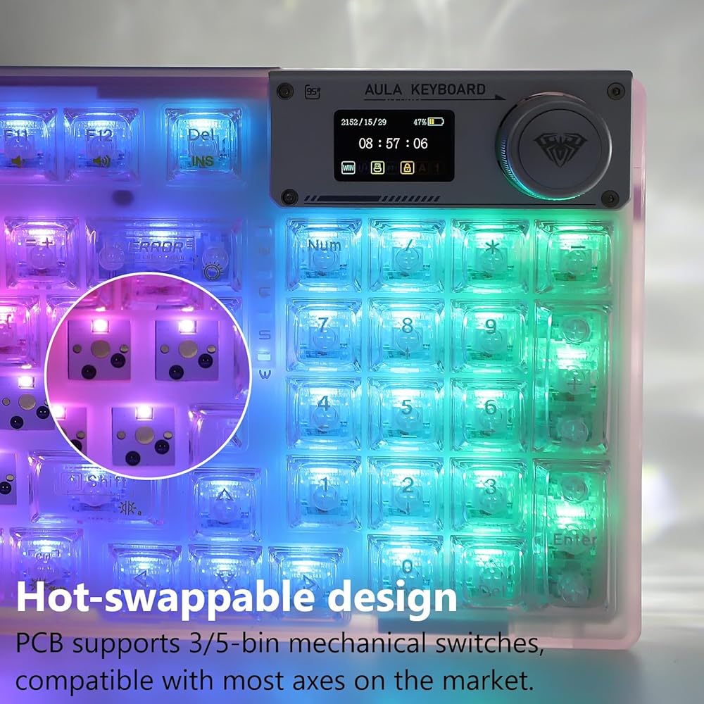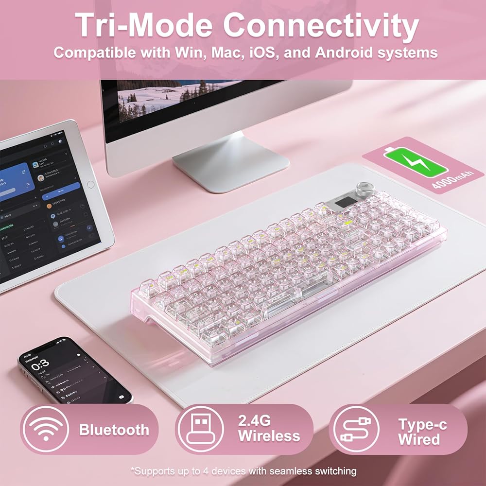 Support for multiple system and device connections】The transparent wireless keyboard can quickly switch between Bluetooth 5.0 & 2.4GHz & USB-C connections through a combination of OLED smart screen or hot keys. The keyboard is powered by a 4000mAh battery, and a separate battery compartment is designed so that the battery can be replaced without disassembling the keyboard if you want to replace it with a higher capacity battery. It is compatible with laptops, iPad, IOS, Windows,and Android. No complicated connections are required, and the OLED smart screen can be easily switched with a knob.