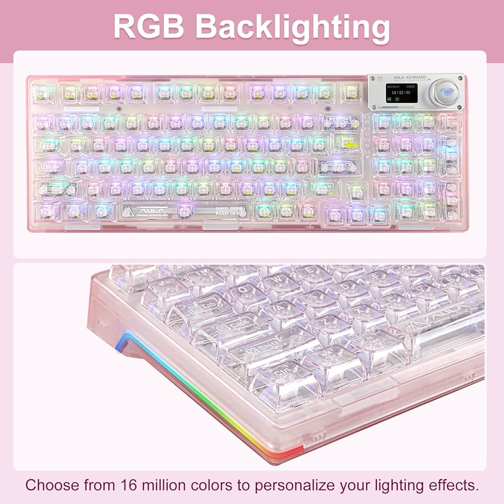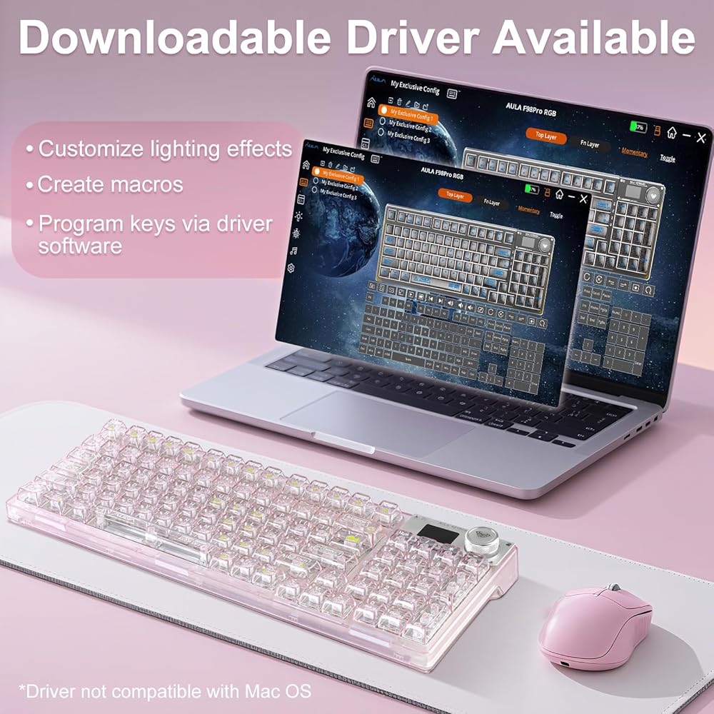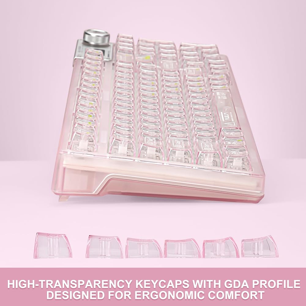 【Mechanical Keyboard with Gasket】Adopting a gasket structure, the keyboard has a cotton multi-layer structure with sound deadening cotton cushion sandwiched inside the keyboard, effectively eliminating typing noise and voids when using this stylish, cute and transparent keyboard. The highly elastic silicone cushion reduces vibration generated during typing, making typing sound softer and more delicate to the touch. *If you need driver software, please contact us.