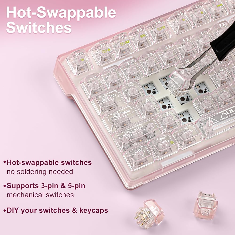 【Special Keycaps Hot Swappble Switch Mechanical Keyboard】 The hot-swappable design is compatible with commercially available PCBs and 3Pin/5Pin mechanical switches. It can be freely replaced even if one of the keys breaks, and there is no need to disassemble the keyboard to replace the axis body. It also provides fast response time.
