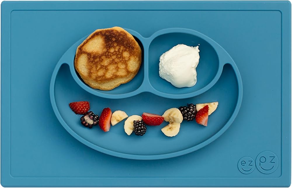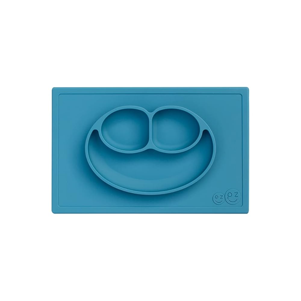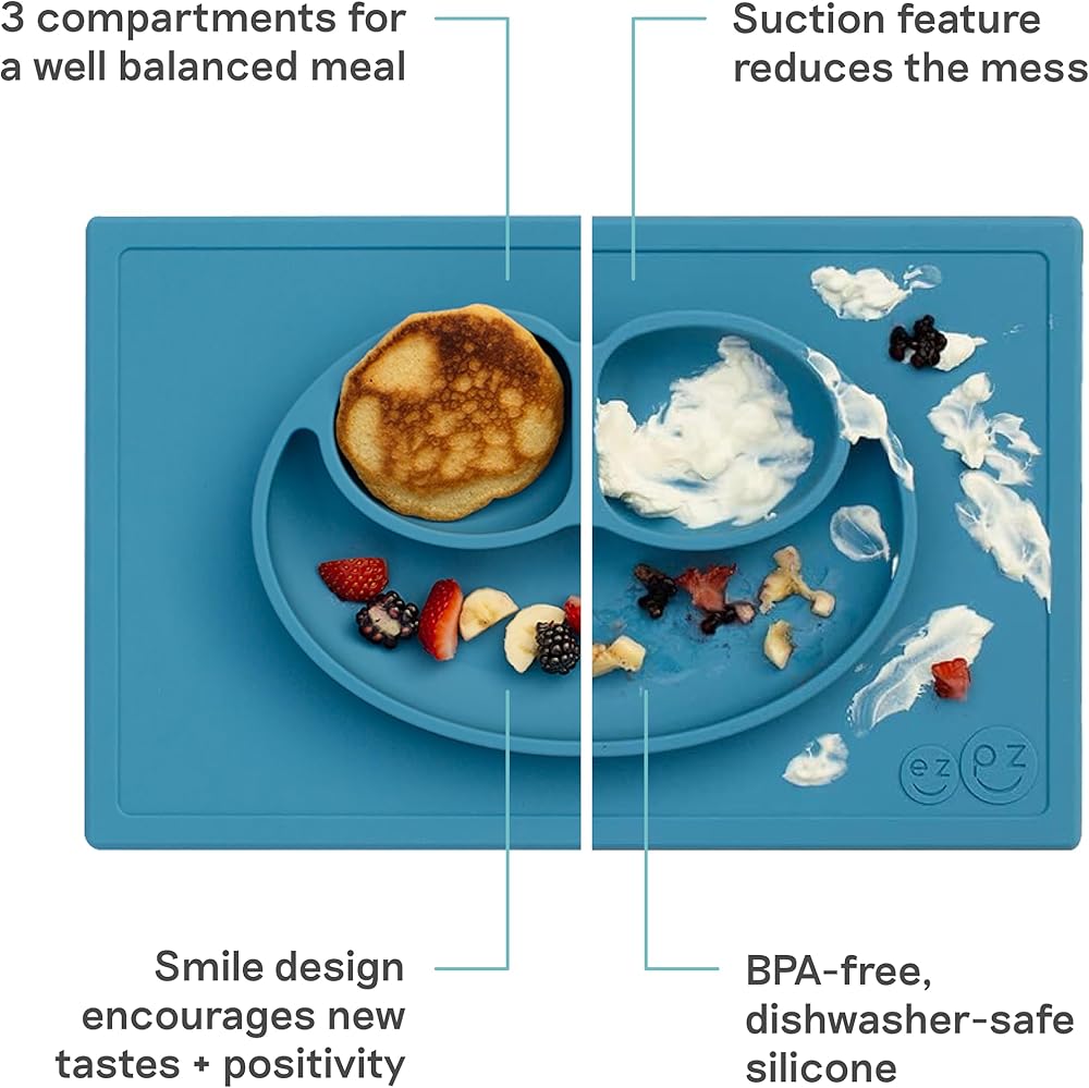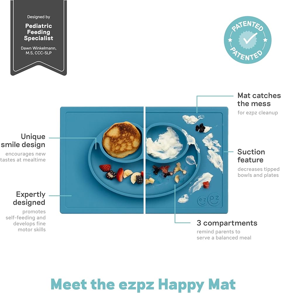 MAKING MEALTIME EZPZ: The Happy Mat's smile design encourages a positive mealtime experience, and the three compartments remind parents to serve a well-balanced meal.