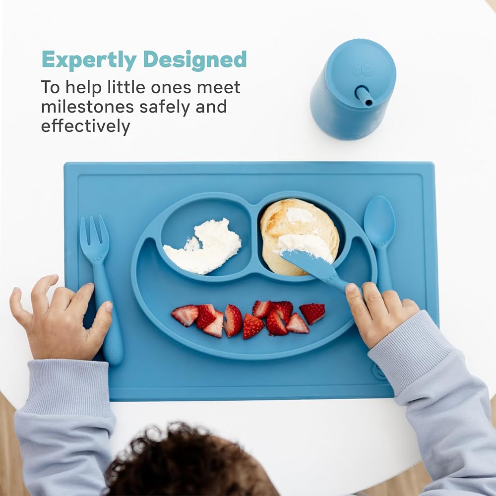 THOUGHTFULLY DESIGNED: The Happy Mat is an all-in-one placemat + plate that suctions to the surface. The mat's stable base reduces tipped bowls / plates and helps toddlers + preschoolers learn to self-feed.