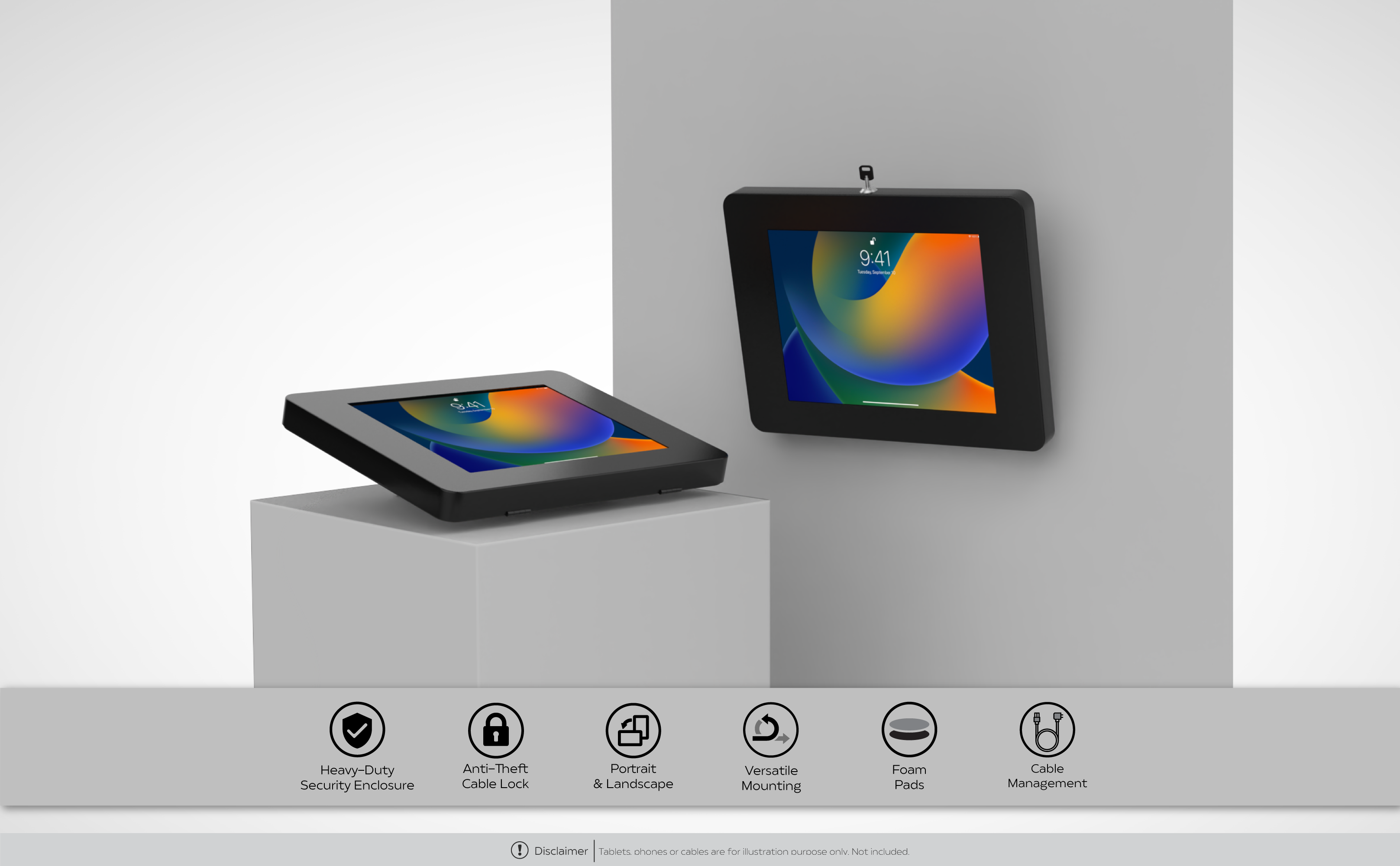This Mount can be elegantly mounted to any surface, a countertop or wall mount, making it a versatile ally in the commercial space. The slope series is perfectly suited for tablet kiosk installations over an outlet. Moreover, the extra storage space allows additional peripherals like Power banks & USB hubs to be housed within the security of the enclosure. Counting with a Kensington Security Slot, this enclosure can be secured as a freestanding countertop tablet kiosk that doesn't have to mounted to the table. Ideal for any environments in retail, healthcare, hospitality & events.