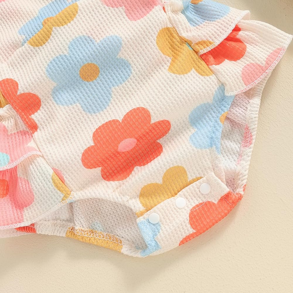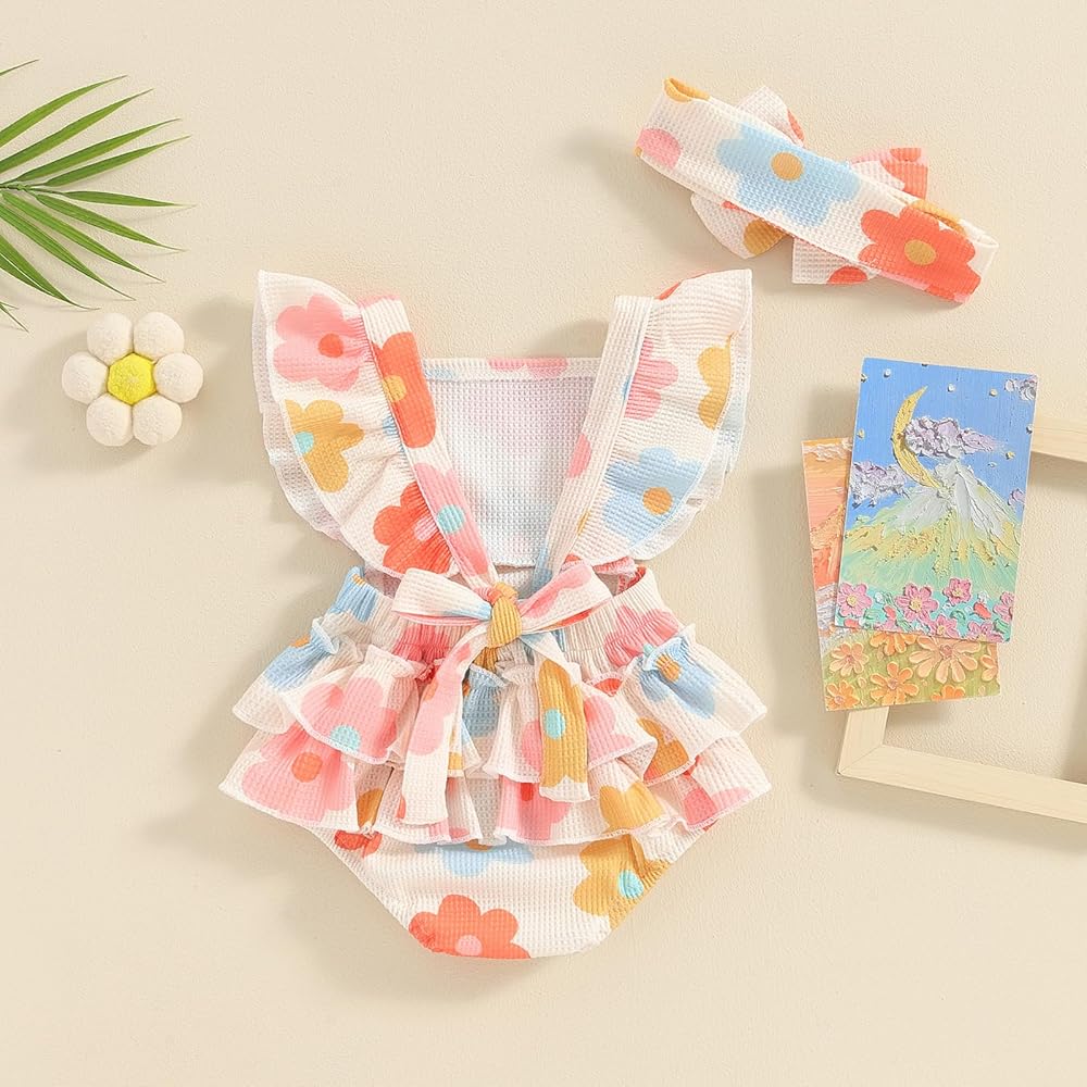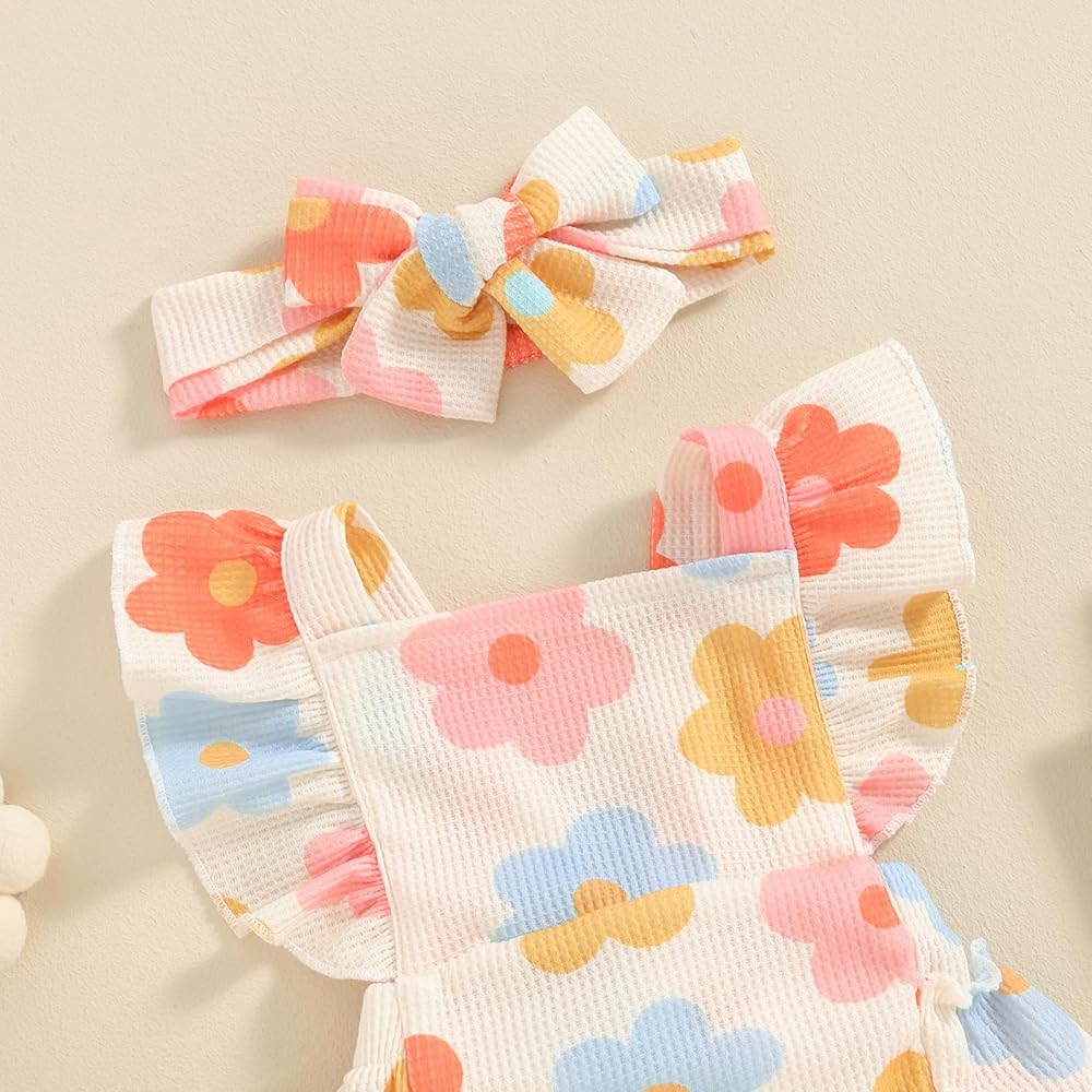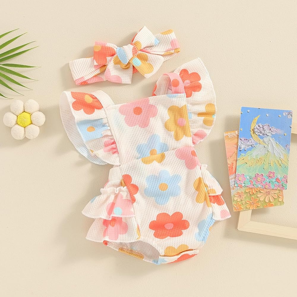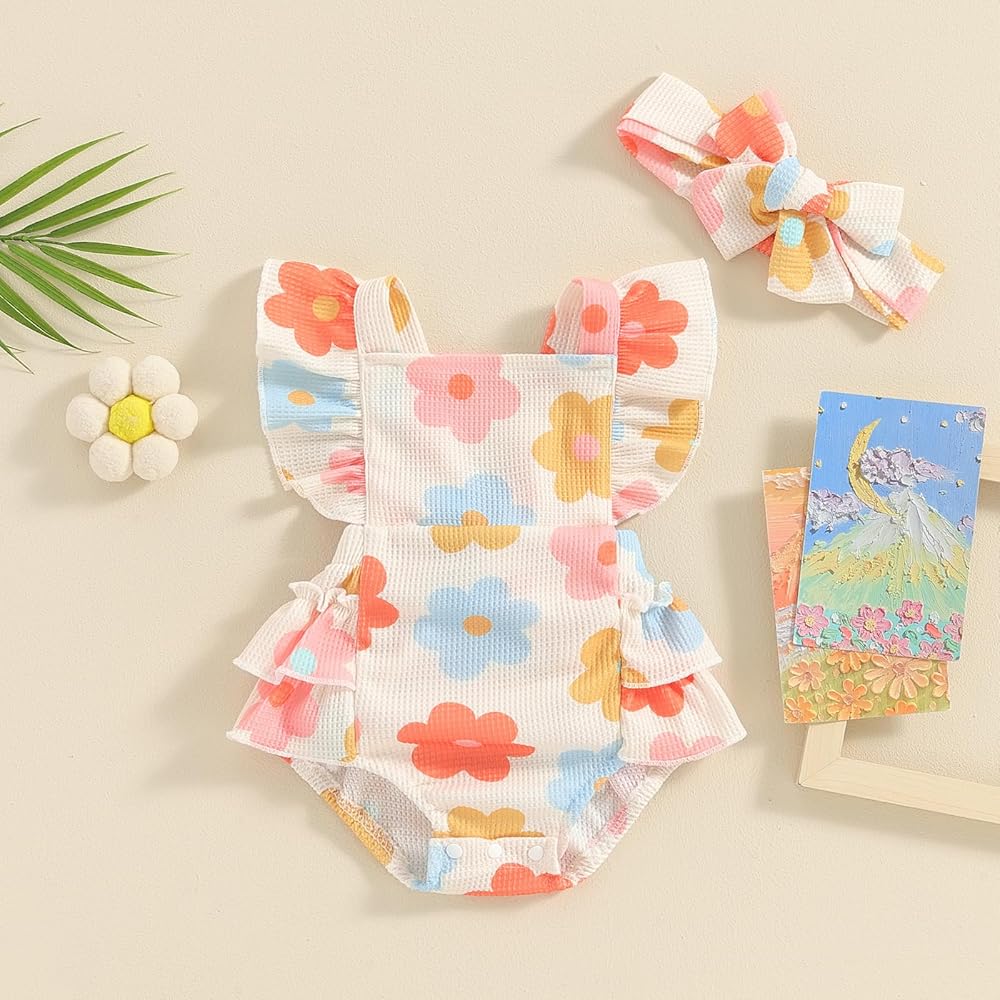 Package Included: 1 x baby girls floral romper + 1 x bow headband. Baby girl summer clothes. Full of beauty, it makes your girl look pretty and lovely.