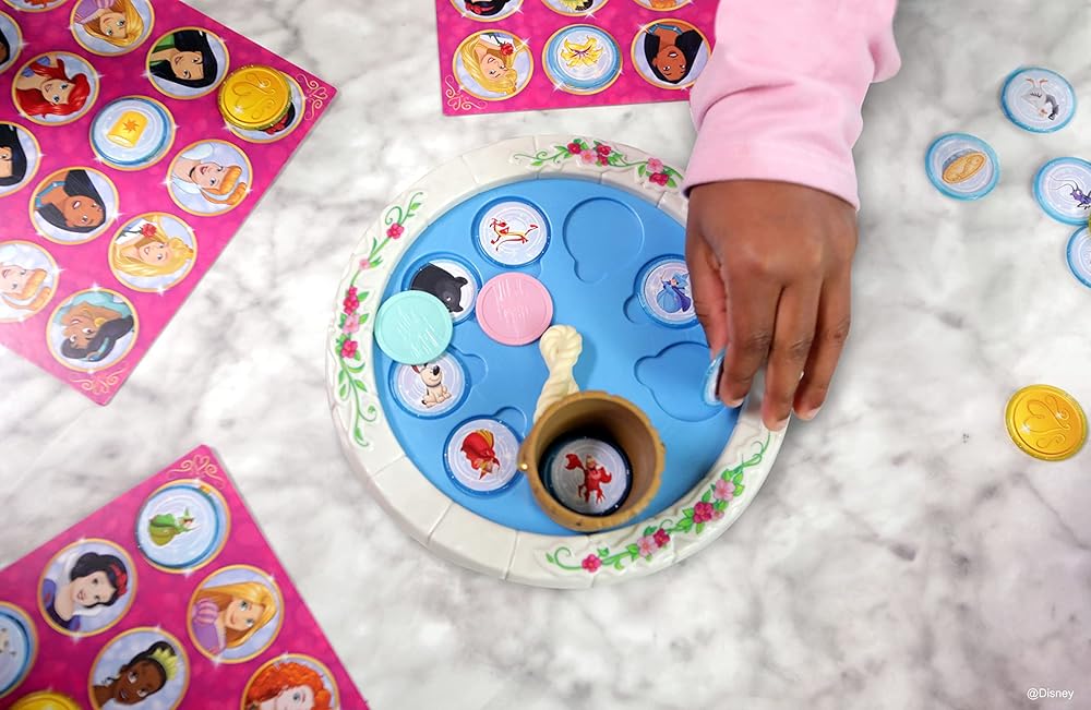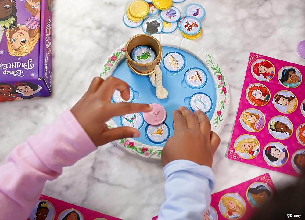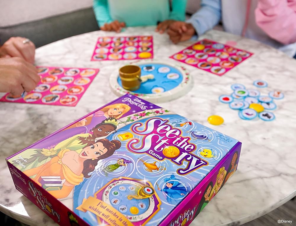 Look into the magical wishing well! You'll see enchanting objects and memorable characters from your favorite Disney Princess stories. Race to find two pictures from the same story! Toss your token into the well and point out two pictures from the same Disney Princess story. If you're right, collect one of the coins for your Disney Princess board! Be the first to collect 4 coins in a row to win! Interesting Gameplay Features • Includes all 12 Disney Princess characters. • Wishing well with spinning bucket puts your family in the fairy tale. • Turn the bucket to magically reveal pictures in the wishing well. • Glittering picture coins include 60 animals, sidekicks, and objects from the Disney Princess films. • Show off your Disney Princess knowledge by finding pictures from the same story. • Kids will get a kick out of being able beat their parents in this game! • Babysitter Approved: Easy to learn, easy to put away, and fun to play!