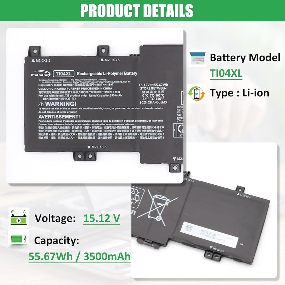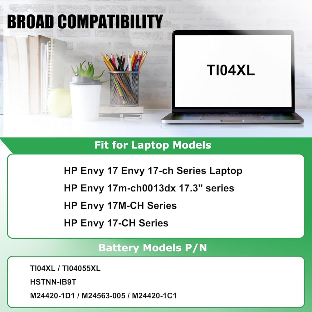 🔋【Battery Specification】Model Name: TI04XL; Voltage: 15.12V; Capacity: 55.67Wh / 3500mAh; Battery Type: Li-ion; Condition: 100% brand new from manufacturer; Color: Black; Packaged come with: 1*battery + battery installation screwdrivers + 1*instruction for laptop battery