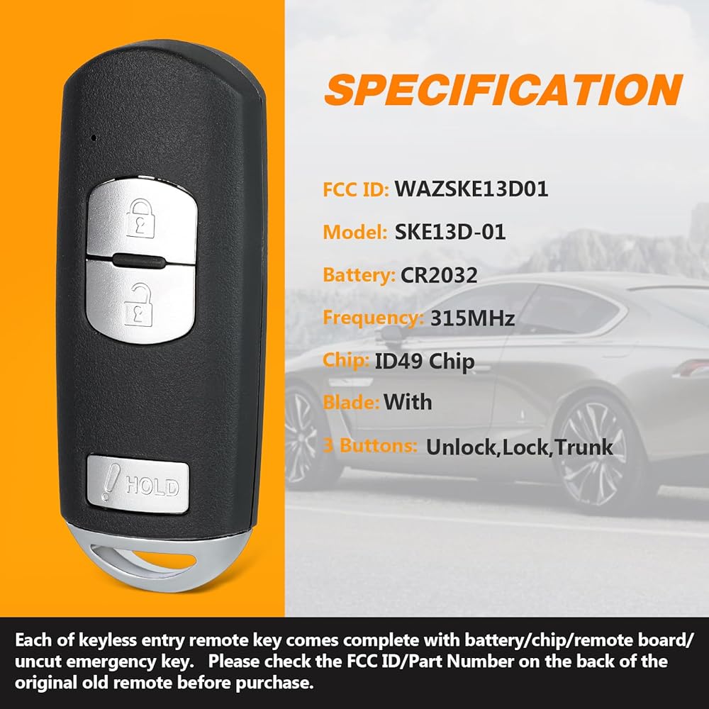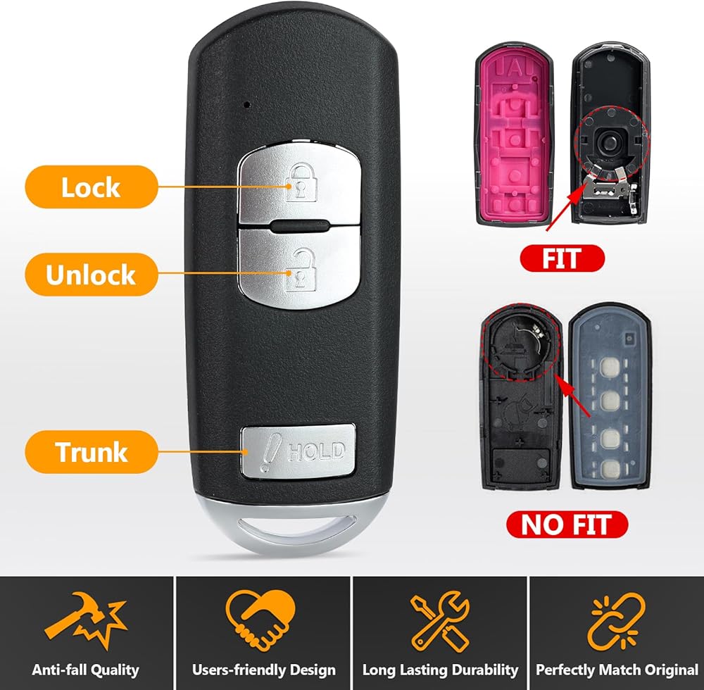 COMPABILITY:For Mazda CX-3 without Power Liftgate 2017 - 2019, for Mazda CX-5 without Power Liftgate 2012 - 2019, for Mazda 3 Hatchback (5-Door) 2014 - 2018, for Mazda Speed 3 2014. Please check the description or use the year/make/model to confirm the compatibility, ensure your key is exactly same as ours(the same shape, buttons)