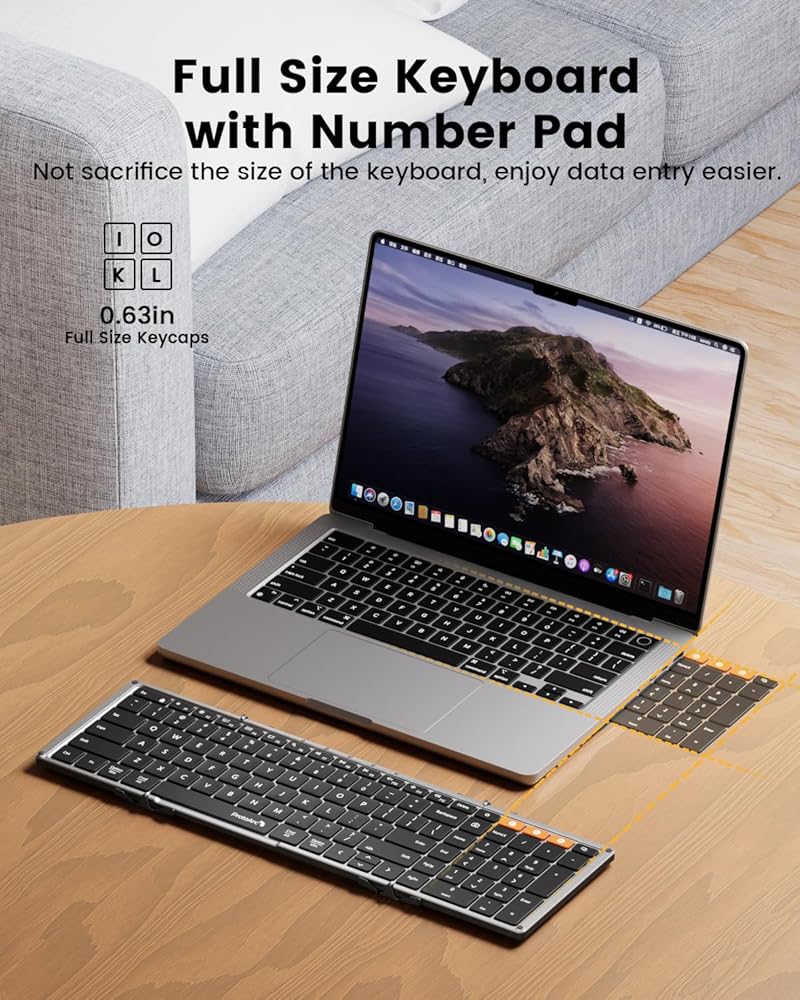 Tri-fold Full Size Keyboard: Our backlit bluetooth keyboard is designed in tri-fold and compact enough for carry. 105-key standard full size QWERTY layout keyboard with number keypad and entire row of shortcut keys,you can type quickly and accurately on a laptop-like keyboard, making your work easier and more productive.