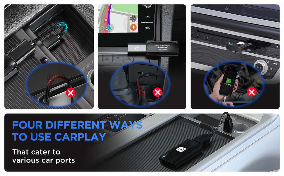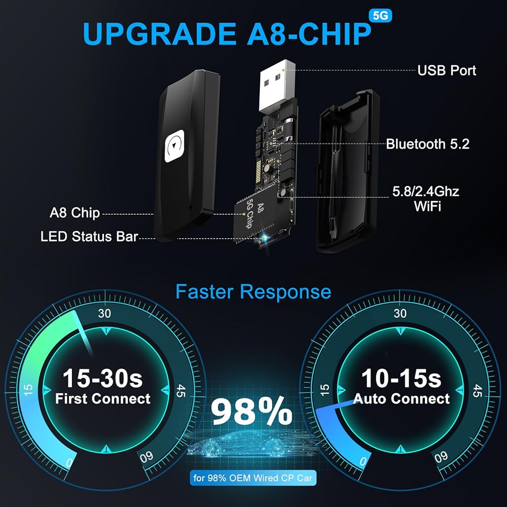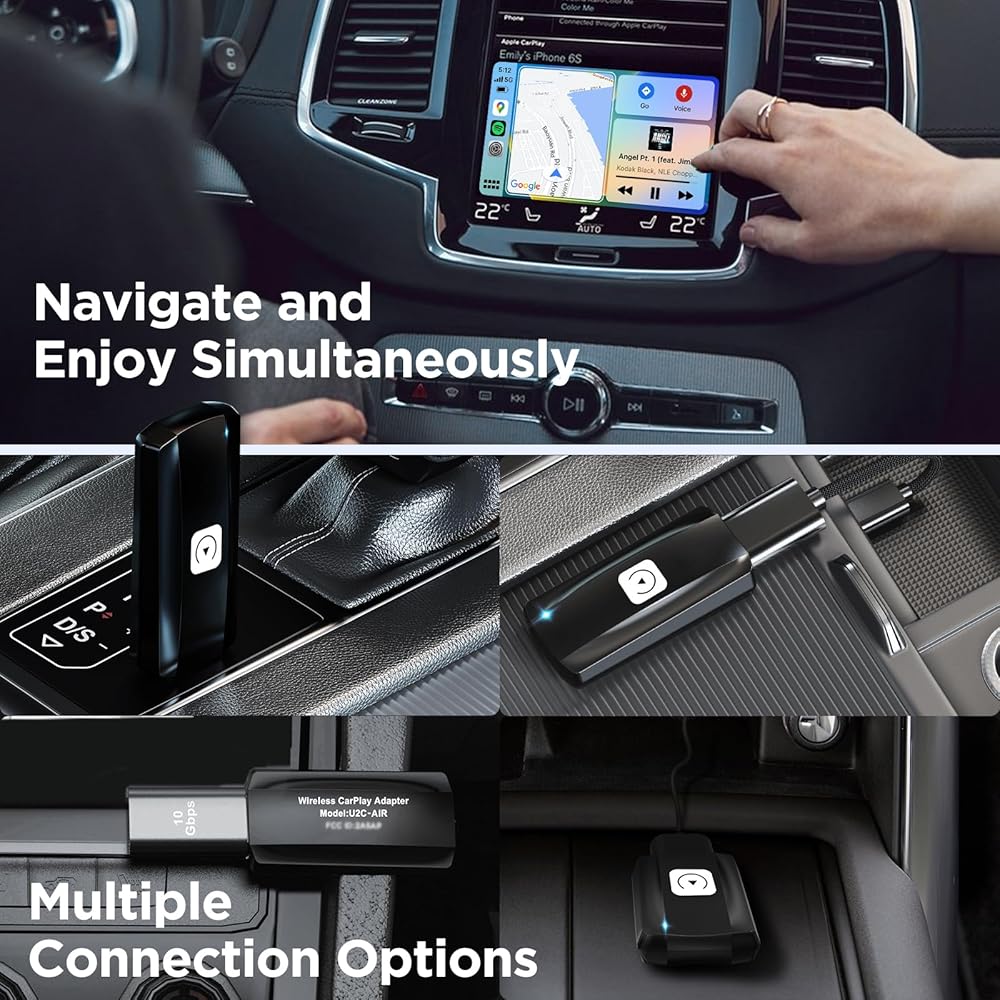 【Fast and Stable Connection】Say goodbye to buffering, lag, and dropouts. The wireless CarPlay adapter is equipped with a 5G chip, 5.8/2.4GHz WiFi, and BT5.2 support, providing lightning-fast and stable connectivity. Even if your iPhone is in your pocket, it can be easily recognized, letting you enjoy uninterrupted Spotify, podcasts, reading messages, and GPS live navigation anytime