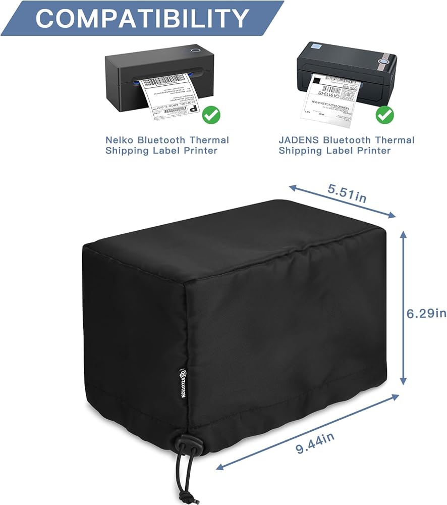 【Compatibility】Size: approximately 9.45 x 5.51 x 6.29inches. This label printer dust cover is tailored for Nelko Bluetooth Thermal Shipping Label Printer, compatible with JADENS Bluetooth Thermal Shipping Label Printer. Note please check your lable printer size before purchase.