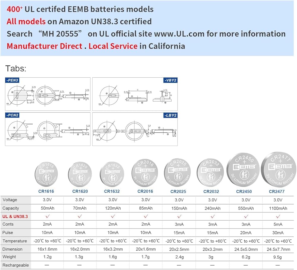 ▷CERTIFICATIONS—This is not a rechargeable battery. DO NOT charge battery. UN 38.3 compliant. More than 400 EEMB battery models are UL certified. Search "MH20555" on UL for all EEMB UL certification information.