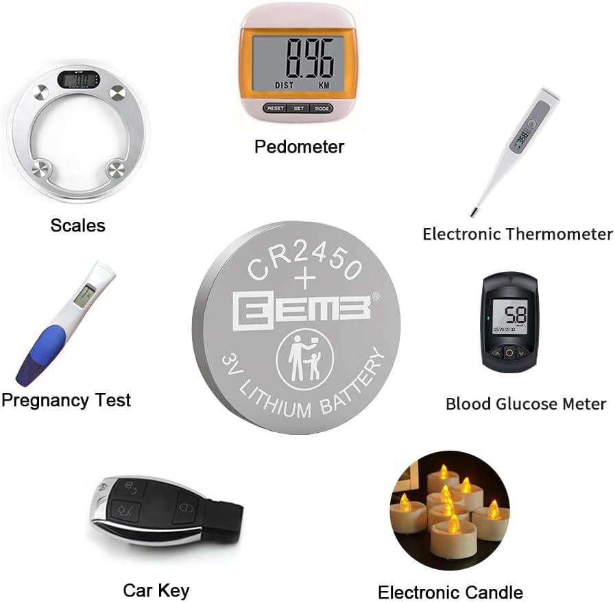 ▷APPLICATION—EEMB CR2450 batteries suitable for remote control, security sensor, wireless thermometers, alarm system sensors, garage door remote, electronic candles, tea lights, clocks, watches, laser pens, fitness appliances, calculators, car key remote, security system, key fob, etc.